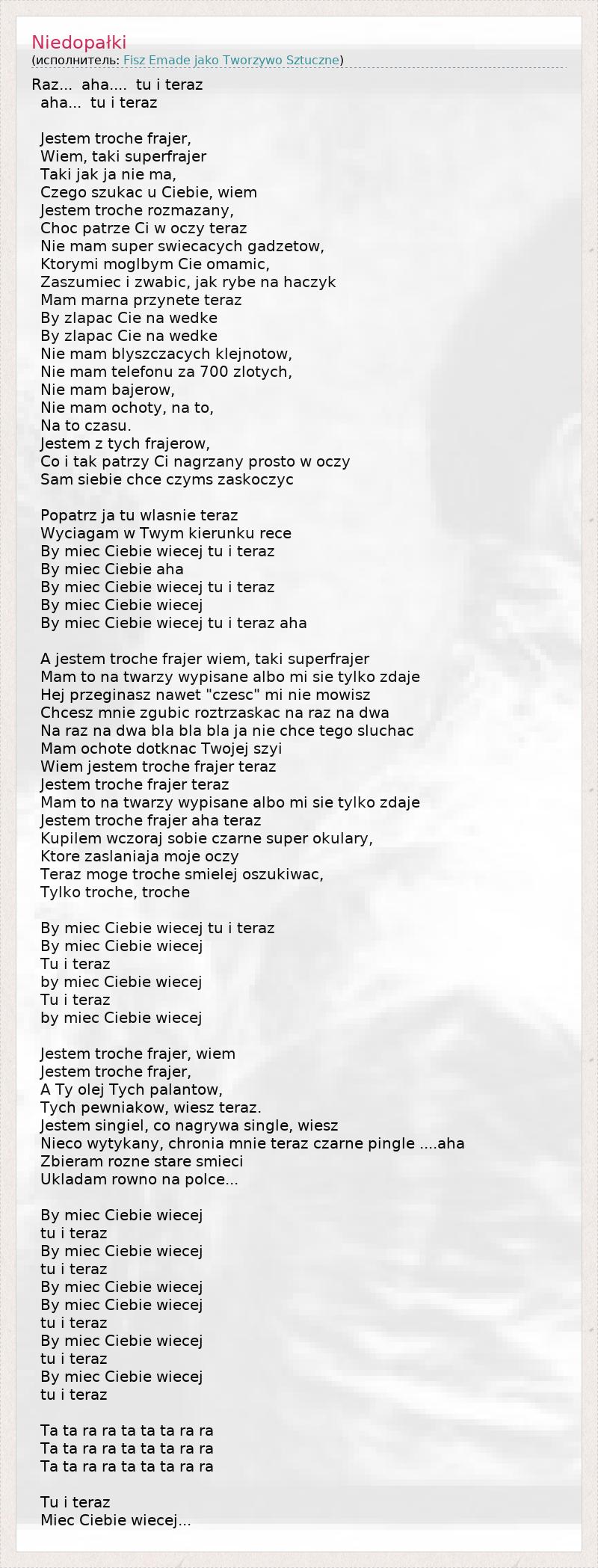 Raz... aha.... tu i teraz aha... tu i teraz Jestem troche frajer, Wiem, taki superfrajer Taki jak ja nie ma, Czego szukac u Ciebie, wiem Jestem troche rozmazany, Choc patrze Ci w oczy teraz Nie mam super swiecacych gadzetow, Ktorymi moglbym Cie omamic, Zaszumiec i zwabic, jak rybe na haczyk Mam marna przynete teraz By zlapac Cie na wedke By zlapac Cie na wedke Nie mam blyszczacych klejnotow, Nie mam telefonu za 700 zlotych, Nie mam bajerow, Nie mam ochoty, na to, Na to czasu. Jestem z tych frajerow, Co i tak patrzy Ci nagrzany prosto w oczy Sam siebie chce czyms zaskoczyc Popatrz ja tu wlasnie teraz Wyciagam w Twym kierunku rece By miec Ciebie wiecej tu i teraz By miec Ciebie aha By miec Ciebie wiecej tu i teraz By miec Ciebie wiecej By miec Ciebie wiecej tu i teraz aha A jestem troche frajer wiem, taki superfrajer Mam to na twarzy wypisane albo mi sie tylko zdaje Hej przeginasz nawet "czesc" mi nie mowisz Chcesz mnie zgubic roztrzaskac na raz na dwa Na raz na dwa bla bla bla ja nie chce tego sluchac Mam ochote dotknac Twojej szyi Wiem jestem troche frajer teraz Jestem troche frajer teraz Mam to na twarzy wypisane albo mi sie tylko zdaje Jestem troche frajer aha teraz Kupilem wczoraj sobie czarne super okulary, Ktore zaslaniaja moje oczy Teraz moge troche smielej oszukiwac, Tylko troche, troche By miec Ciebie wiecej tu i teraz By miec Ciebie wiecej Tu i teraz by miec Ciebie wiecej Tu i teraz by miec Ciebie wiecej Jestem troche frajer, wiem Jestem troche frajer, A Ty olej Tych palantow, Tych pewniakow, wiesz teraz. Jestem singiel, co nagrywa single, wiesz Nieco wytykany, chronia mnie teraz czarne pingle ....aha Zbieram rozne stare smieci Ukladam rowno na polce... By miec Ciebie wiecej tu i teraz By miec Ciebie wiecej tu i teraz By miec Ciebie wiecej By miec Ciebie wiecej tu i teraz By miec Ciebie wiecej tu i teraz By miec Ciebie wiecej tu i teraz Ta ta ra ra ta ta ta ra ra Ta ta ra ra ta ta ta ra ra Ta ta ra ra ta ta ta ra ra Tu i teraz Miec Ciebie wiecej...