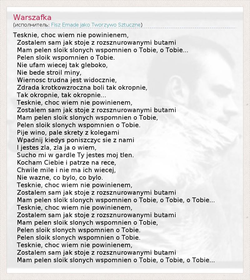 Tesknie, choc wiem nie powinienem, Zostalem sam jak stoje z rozsznurowanymi butami Mam pelen sloik slonych wspomnien o Tobie, o Tobie... Pelen sloik wspomnien o Tobie. Nie ufam wiecej tak gleboko, Nie bede stroil miny, Wiernosc trudna jest widocznie, Zdrada krotkowzroczna boli tak okropnie, Tak okropnie, tak okropnie... Tesknie, choc wiem nie powinienem, Zostalem sam jak stoje z rozsznurowanymi butami Mam pelen sloik slonych wspomnien o Tobie, Pelen sloik slonych wspomnien o Tobie. Pije wino, pale skrety z kolegami Wpadnij kiedys poniszczyc sie z nami I jestes zla, zla ja o wiem, Sucho mi w gardle Ty jestes moj tlen. Kocham Ciebie i patrze na rece, Chwile mile i nie ma ich wiecej, Nie wazne, co bylo, co bylo. Tesknie, choc wiem nie powinienem, Zostalem sam jak stoje z rozsznurowanymi butami Mam pelen sloik slonych wspomnien o Tobie, o Tobie, o Tobie... Tesknie, choc wiem nie powinienem, Zostalem sam jak stoje z rozsznurowanymi butami Mam pelen sloik slonych wspomnien o Tobie, Pelen sloik slonych wspomnien o Tobie. Pelen sloik slonych wspomnien o Tobie. Tesknie, choc wiem nie powinienem, Zostalem sam jak stoje z rozsznurowanymi butami Mam pelen sloik slonych wspomnien o Tobie, o Tobie, o Tobie...