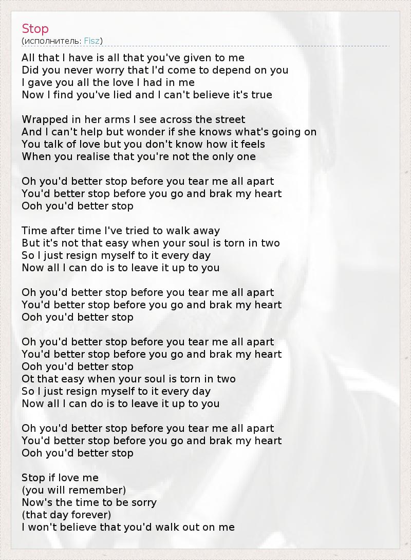 Всё, что у меня есть, дал мне ты Неужели тебе безразлично, что я завишу от тебя? Я отдала тебе всю свою любовь Теперь я узнала, что ты лгал и я не могу в это поверить Я вижу тебя в её объятьях на другой стороне улицы И я ничего не могу поделать, но хорошо если она узнает, что происходит Ты говоришь о любви, но ты не знаешь что это такое Когда же ты поймёшь, что ты не единственный? О, тебе лучше остановиться, пока ты не разрушил мою жизнь Тебе лучше остановиться, до того как ты уйдёшь и разобьёшь мне сердце О, тебе лучше остановиться Снова и снова я пытаюсь уйти Но это не так легко, когда твоя душа расколота надвое И каждый день я смиряюсь Теперь всё, что я могу сделать - оставить выбор за тобой О, тебе лучше остановиться, пока ты не разрушил мою жизнь Тебе лучше остановиться, до того как ты уйдёшь и разобьёшь мне сердце О, тебе лучше остановиться Нелегко, когда твоя душа расколота надвое И каждый день я смиряюсь Теперь всё, что я могу сделать - оставить выбор за тобой О, тебе лучше остановиться, пока ты не разрушил мою жизнь Тебе лучше остановиться, до того как ты уйдёшь и разобьёшь мне сердце О, тебе лучше остановиться Остановись, если любишь меня (Ты будешь помнить...) Настало время просить прощения (that day forever) (...этот день вечно) Я не могу поверить что теряю тебя