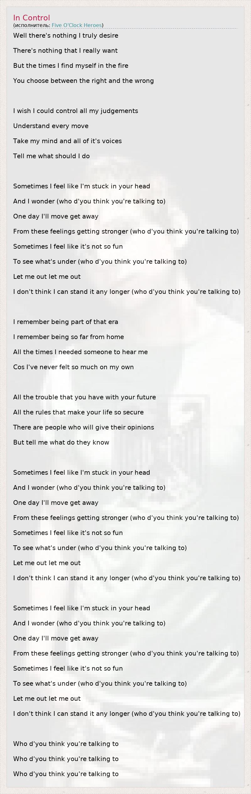 Well there's nothing I truly desire There's nothing that I really want But the times I find myself in the fire You choose between the right and the wrong I wish I could control all my judgements Understand every move Take my mind and all of it's voices Tell me what should I do Sometimes I feel like I'm stuck in your head And I wonder (who d'you think you're talking to) One day I'll move get away From these feelings getting stronger (who d'you think you're talking to) Sometimes I feel like it's not so fun To see what's under (who d'you think you're talking to) Let me out let me out I don't think I can stand it any longer (who d'you think you're talking to) I remember being part of that era I remember being so far from home All the times I needed someone to hear me Cos I've never felt so much on my own All the trouble that you have with your future All the rules that make your life so secure There are people who will give their opinions But tell me what do they know Sometimes I feel like I'm stuck in your head And I wonder (who d'you think you're talking to) One day I'll move get away From these feelings getting stronger (who d'you think you're talking to) Sometimes I feel like it's not so fun To see what's under (who d'you think you're talking to) Let me out let me out I don't think I can stand it any longer (who d'you think you're talking to) Sometimes I feel like I'm stuck in your head And I wonder (who d'you think you're talking to) One day I'll move get away From these feelings getting stronger (who d'you think you're talking to) Sometimes I feel like it's not so fun To see what's under (who d'you think you're talking to) Let me out let me out I don't think I can stand it any longer (who d'you think you're talking to) Who d'you think you're talking to Who d'you think you're talking to Who d'you think you're talking to