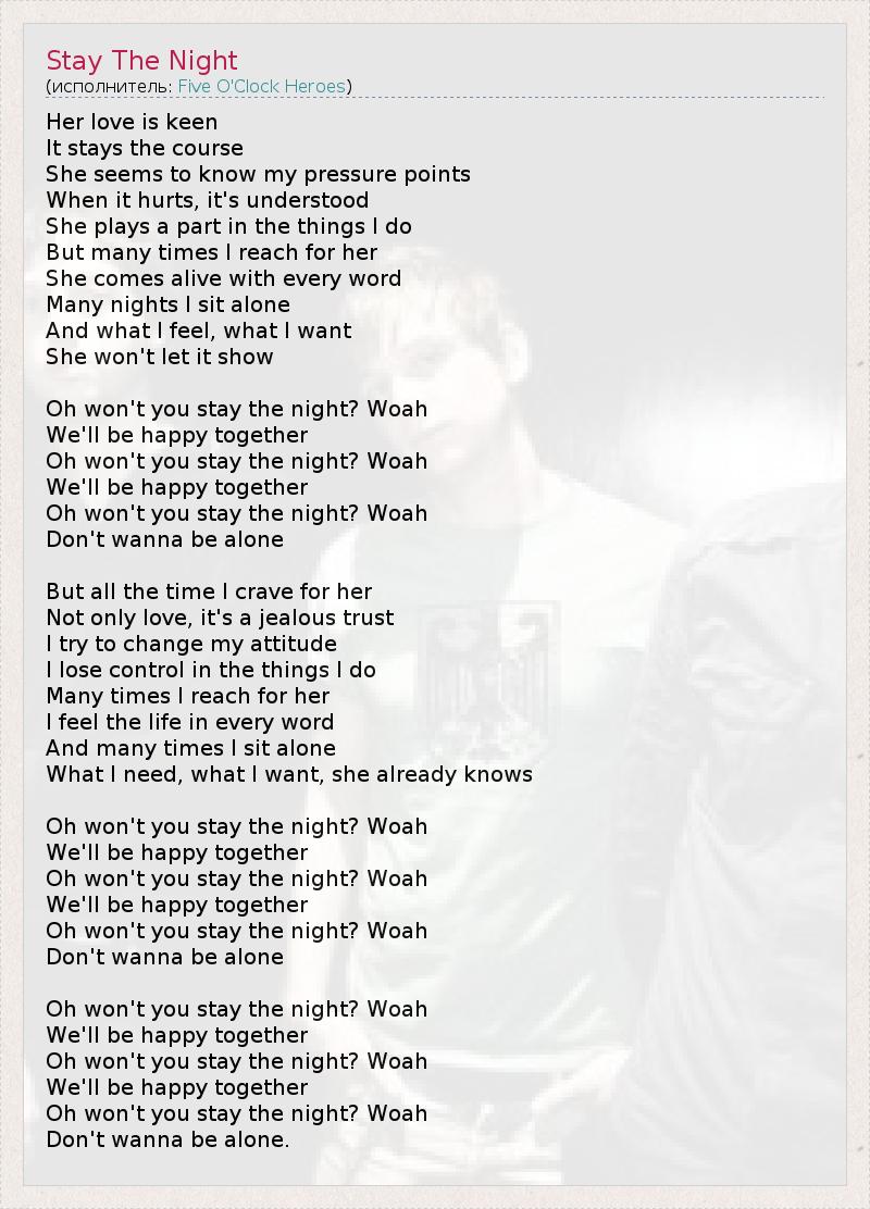 Her love is keen It stays the course She seems to know my pressure points When it hurts, it's understood She plays a part in the things I do But many times I reach for her She comes alive with every word Many nights I sit alone And what I feel, what I want She won't let it show Oh won't you stay the night? Woah We'll be happy together Oh won't you stay the night? Woah We'll be happy together Oh won't you stay the night? Woah Don't wanna be alone But all the time I crave for her Not only love, it's a jealous trust I try to change my attitude I lose control in the things I do Many times I reach for her I feel the life in every word And many times I sit alone What I need, what I want, she already knows Oh won't you stay the night? Woah We'll be happy together Oh won't you stay the night? Woah We'll be happy together Oh won't you stay the night? Woah Don't wanna be alone Oh won't you stay the night? Woah We'll be happy together Oh won't you stay the night? Woah We'll be happy together Oh won't you stay the night? Woah Don't wanna be alone.