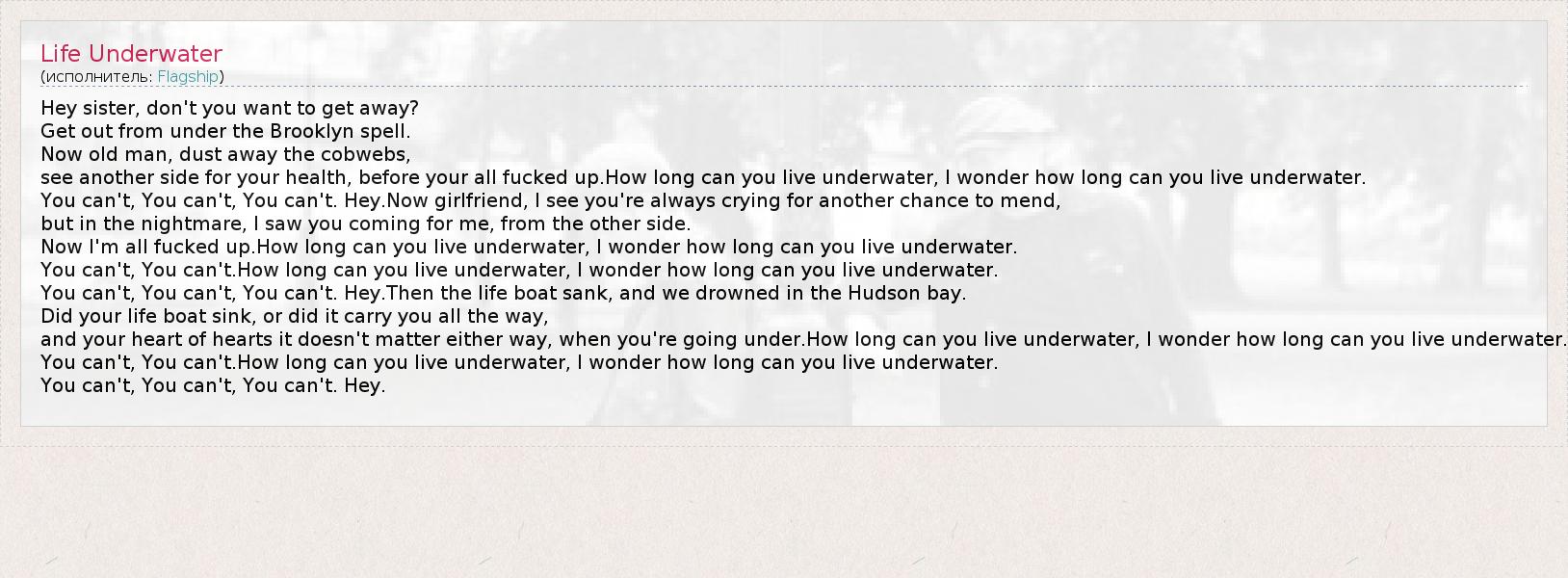 Hey sister, don't you want to get away? Get out from under the Brooklyn spell. Now old man, dust away the cobwebs, see another side for your health, before your all fucked up.How long can you live underwater, I wonder how long can you live underwater. You can't, You can't, You can't. Hey.Now girlfriend, I see you're always crying for another chance to mend, but in the nightmare, I saw you coming for me, from the other side. Now I'm all fucked up.How long can you live underwater, I wonder how long can you live underwater. You can't, You can't.How long can you live underwater, I wonder how long can you live underwater. You can't, You can't, You can't. Hey.Then the life boat sank, and we drowned in the Hudson bay. Did your life boat sink, or did it carry you all the way, and your heart of hearts it doesn't matter either way, when you're going under.How long can you live underwater, I wonder how long can you live underwater. You can't, You can't.How long can you live underwater, I wonder how long can you live underwater. You can't, You can't, You can't. Hey.