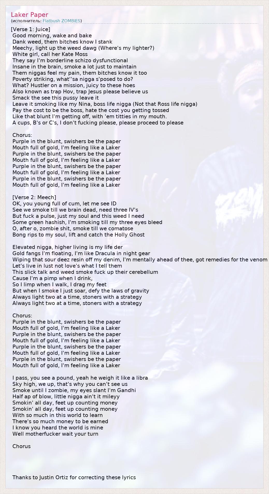 [Verse 1: Juice] Good morning, wake and bake Dank weed, them bitches know I stank Meechy, light up the weed dawg (Where's my lighter?) White girl, call her Kate Moss They say I'm borderline schizo dysfunctional Insane in the brain, smoke a lot just to maintain Them niggas feel my pain, them bitches know it too Poverty striking, what''sa nigga s'posed to do? What? Hustler on a mission, juicy to these hoes Also known as trap Hov, trap Jesus please believe us Smack the see this pussy leave it Leave it smoking like my Nina, boss life nigga (Not that Ross life nigga) Pay the cost to be the boss, hate the cost you getting tossed Like that blunt I'm getting off, with 'em titties in my mouth. A cups, B's or C's, I don't fucking please, please proceed to please Chorus: Purple in the blunt, swishers be the paper Mouth full of gold, I'm feeling like a Laker Purple in the blunt, swishers be the paper Mouth full of gold, I'm feeling like a Laker Purple in the blunt, swishers be the paper Mouth full of gold, I'm feeling like a Laker Purple in the blunt, swishers be the paper Mouth full of gold, I'm feeling like a Laker [Verse 2: Meech] OK, you young full of cum, let me see ID See we smoke till we brain dead, need three IV's But fuck a pulse, just my soul and this weed I need Some green hashish, I'm smoking till my three eyes bleed O, after o, zombie shit, smoke till we comatose Bong rips to my soul, lift and catch the Holly Ghost Elevated nigga, higher living is my life der Gold fangs I'm floating, I'm like Dracula in night gear Wiping that sour deez resin off my denim, I'm mentally ahead of thee, got remedies for the venom Let's live in lust not love's what I tell them This slick talk and weed smoke fuck up their cerebellum Cause I'm a pimp when I drink, So I limp when I walk, I drag my feet But when I smoke I just soar, defy the laws of gravity Always light two at a time, stoners with a strategy Always light two at a time, stoners with a strategy Chorus: Purple in the blunt, swishers be the paper Mouth full of gold, I'm feeling like a Laker Purple in the blunt, swishers be the paper Mouth full of gold, I'm feeling like a Laker Purple in the blunt, swishers be the paper Mouth full of gold, I'm feeling like a Laker Purple in the blunt, swishers be the paper Mouth full of gold, I'm feeling like a Laker I pass, you see a pound, yeah he weigh it like a libra Sky high, we up, that's why you can't see us Smoke until I zombie, my eyes slant I'm Gandhi Half ap of blow, little nigga ain't it mileyy Smokin' all day, feet up counting money Smokin' all day, feet up counting money With so much in this world to learn There's so much money to be earned I know you heard the world is mine Well motherfucker wait your turn Chorus Thanks to Justin Ortiz for correcting these lyrics