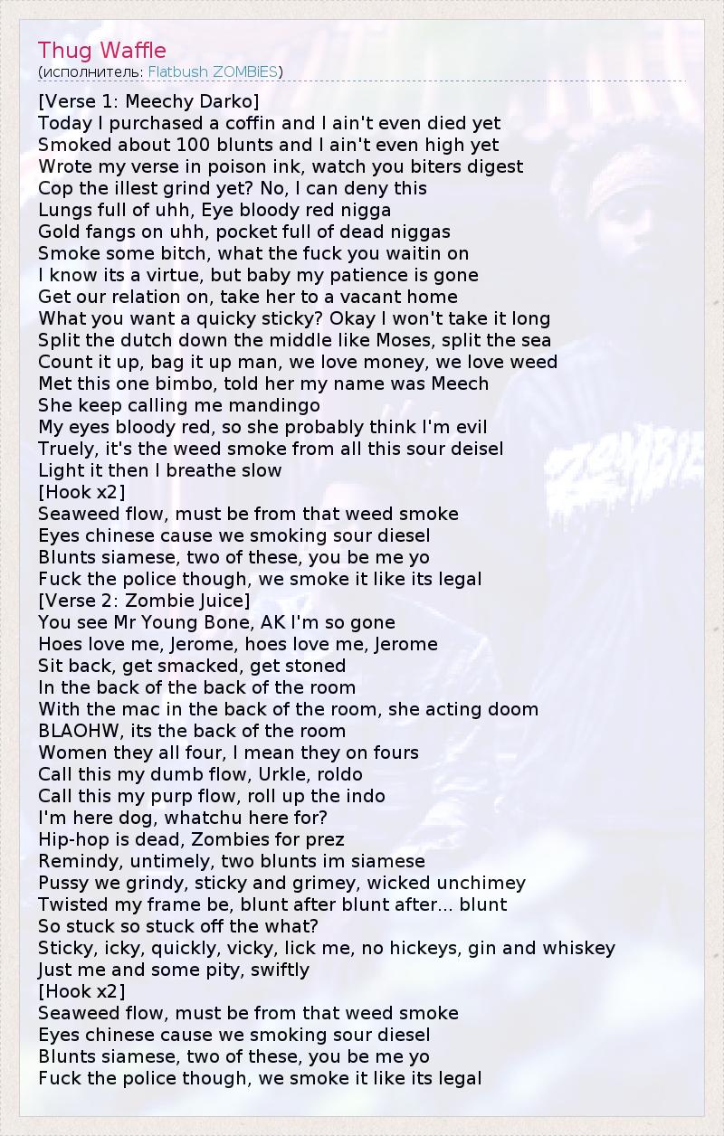 [Verse 1: Meechy Darko] Today I purchased a coffin and I ain't even died yet Smoked about 100 blunts and I ain't even high yet Wrote my verse in poison ink, watch you biters digest Cop the illest grind yet? No, I can deny this Lungs full of uhh, Eye bloody red nigga Gold fangs on uhh, pocket full of dead niggas Smoke some bitch, what the fuck you waitin on I know its a virtue, but baby my patience is gone Get our relation on, take her to a vacant home What you want a quicky sticky? Okay I won't take it long Split the dutch down the middle like Moses, split the sea Count it up, bag it up man, we love money, we love weed Met this one bimbo, told her my name was Meech She keep calling me mandingo My eyes bloody red, so she probably think I'm evil Truely, it's the weed smoke from all this sour deisel Light it then I breathe slow [Hook x2] Seaweed flow, must be from that weed smoke Eyes chinese cause we smoking sour diesel Blunts siamese, two of these, you be me yo Fuck the police though, we smoke it like its legal [Verse 2: Zombie Juice] You see Mr Young Bone, AK I'm so gone Hoes love me, Jerome, hoes love me, Jerome Sit back, get smacked, get stoned In the back of the back of the room With the mac in the back of the room, she acting doom BLAOHW, its the back of the room Women they all four, I mean they on fours Call this my dumb flow, Urkle, roldo Call this my purp flow, roll up the indo I'm here dog, whatchu here for? Hip-hop is dead, Zombies for prez Remindy, untimely, two blunts im siamese Pussy we grindy, sticky and grimey, wicked unchimey Twisted my frame be, blunt after blunt after... blunt So stuck so stuck off the what? Sticky, icky, quickly, vicky, lick me, no hickeys, gin and whiskey Just me and some pity, swiftly [Hook x2] Seaweed flow, must be from that weed smoke Eyes chinese cause we smoking sour diesel Blunts siamese, two of these, you be me yo Fuck the police though, we smoke it like its legal
