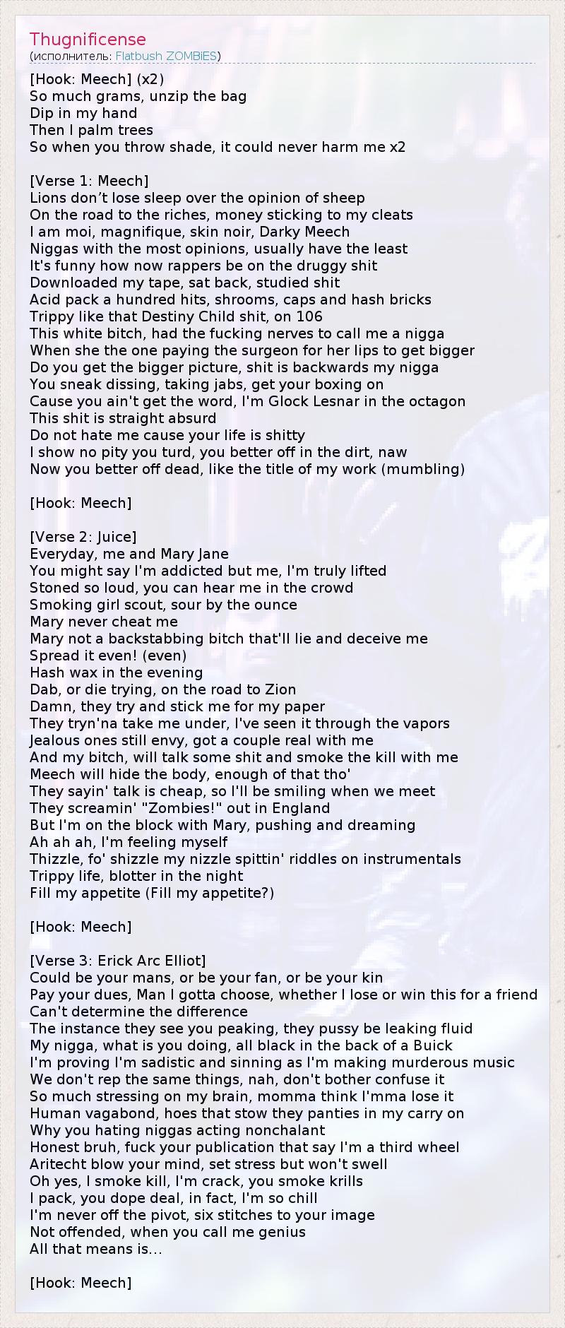 [Припев : Мич ] (x2) Столько грамм , распаковать сумку Окунитесь в моей руке Тогда я пальмы Поэтому, когда вы бросаете тень , он никогда не мог навредить мне x2 [ Стих 1 : Мич ] Львы не теряют сон из-за мнению овец По дороге вбогатство , деньги придерживаться моих утки Я Moi , Magnifique , нуар кожи, Дарки Мич Нигеров с наибольшим количеством мнений , как правило, имеют меньше Это забавно, как сейчас рэперы быть на наркоман дерьма Скачано мою ленту , откинулся на спинку стула , учился дерьмо Кислота пакет сотню хитов, грибы , шапки и хэш кирпичи Trippy как тот Destiny Child дерьма , на 106 Этот белый сука, были гребаные нервы позвонить мне ниггер Когда она один платит хирургу для губ , чтобы получить больше Вы получаете более широкую картину, дерьмо имеет обратную мой ниггер Вы прокрасться Диссинг , принимая удары , получить бокс на Потому что вы не получить слово , я Глок Леснар в восьмиугольник Это дерьмо прямо абсурд Не ненавидеть меня, потому ваша жизнь хреново Я не проявляют жалость вы какашка , вы лучше в грязь , Нау Теперь вы лучше умереть , как название моей работы ( бормоча ) [Припев : Мич ] [Куплет 2 : Сок ] Каждый день , я и Мэри Джейн Можно сказать, что я пристрастился , кроме меня , я действительно поднял Stoned так громко , что ты меня слышишь в толпе Курение девушка разведчик , кислый на унцию Мария никогда не обмануть меня Мария неBackstabbing сука , что буду лгать и обманывать меня Распространение его даже ! (даже ) Хэш воск вечером Даб , или погибают, пытаясь , по дороге в Сионе Черт , они пытаются придерживаться меня для моей работе Они tryn'na взять меня под , я видел его через паров Ревнивый те еще зависть , есть пара реальном со мной И моя сука , будет говорить какое-то дерьмо и курить убить со мной Мич будет спрятать тело , достаточно того, что хотя ' Они говорю " слова стоят дешево , так что я буду улыбаться, когда мы встречаемся Они кричать от восторга " зомби! " в Англии Но я на блоке с Мэри , толкая и мечтать Ай ай ай , я чувствую себя Thizzle , FO ' SHIZZLE моего nizzle Spittin ' загадки на инструментальные Trippy жизнь , папье в ночь Заполните свой аппетит ( Заполните свой аппетит ? ) [Припев : Мич ] [ Стих 3 : Эрик дуги Эллиот ] Может быть ваши мужчин , или быть вашим поклонником , или быть вашим кин Оплатить сборы , парня я должен выбрать , будь потерять я или выиграть это для друга Невозможно определить разницу Экземпляр они видят вас пика , они киска течь жидкости Мой ниггер , что же ты делаешь , все черное в задней части Buick Я доказывая Я садистский и грешить , как я делаю убийственный музыку Мы не представитель те же самые вещи , нах , не беспокойтесь путать Так много подчеркнув в моем мозгу , мама думаю I'mma потерять его Человека бродячие , мотыги , что уложить их трусики в моем нести на Почему вы ненавидеть ниггеров , действующие беспечным Честный Брух , ебать вашу публикацию , что сказать , что я третье колесо Aritecht сразит вас наповал , установить напряжение , но не будет набухать Ах да, я курю убить , я трещина, Вы курите krills Я пакет , вы допинг сделку , на самом деле , я так холод Я никогда не от оси , шесть стежков в ваш образ Не обижайтесь, когда ты зовешь меня гений Все это означает, ... [Припев : Мич ]
