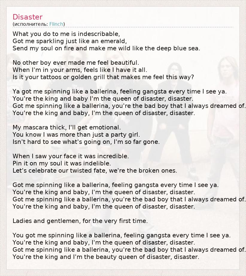 What you do to me is indescribable, Got me sparkling just like an emerald, Send my soul on fire and make me wild like the deep blue sea. No other boy ever made me feel beautiful. When I'm in your arms, feels like I have it all. Is it your tattoos or golden grill that makes me feel this way? Ya got me spinning like a ballerina, feeling gangsta every time I see ya. You're the king and baby I'm the queen of disaster, disaster. Got me spinning like a ballerina, you're the bad boy that I always dreamed of. You're the king and baby, I'm the queen of disaster, disaster. My mascara thick, I'll get emotional. You know I was more than just a party girl. Isn't hard to see what's going on, I'm so far gone. When I saw your face it was incredible. Pin it on my soul it was indelible. Let's celebrate our twisted fate, we're the broken ones. Got me spinning like a ballerina, feeling gangsta every time I see ya. You're the king and baby, I'm the queen of disaster, disaster. Got me spinning like a ballerina, you're the bad boy that I always dreamed of. You're the king and baby, I'm the queen of disaster, disaster. Ladies and gentlemen, for the very first time. You got me spinning like a ballerina, feeling gangsta every time I see ya. You're the king and baby, I'm the queen of disaster, disaster. Got me spinning like a ballerina, you're the bad boy that I always dreamed of. You're the king and I'm the beauty queen of disaster, disaster.