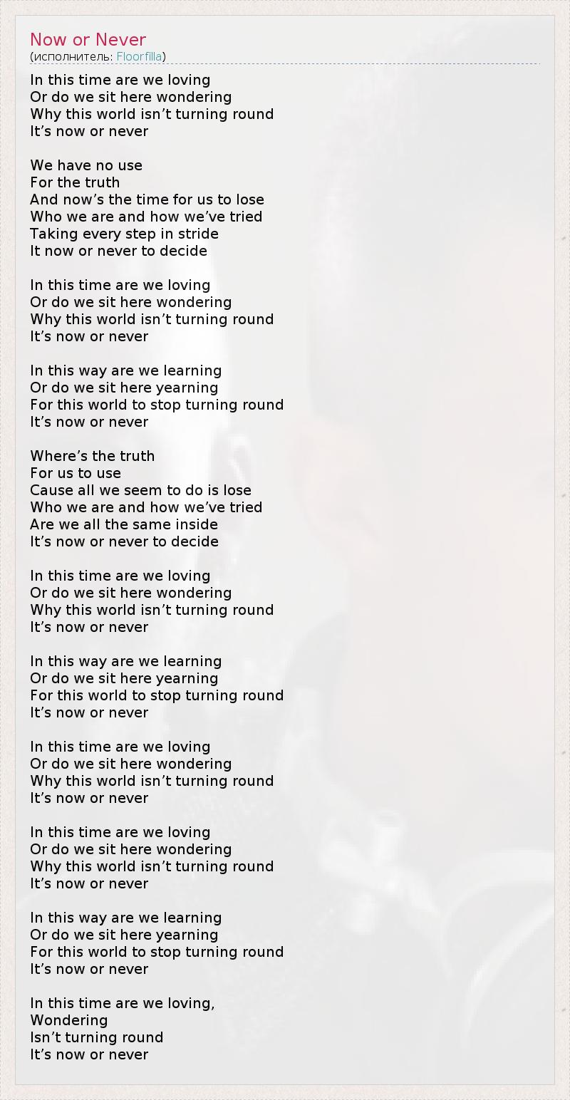 Сейчас или никогда Прямо сейчас, любим ли мы друг друга? Или просто сидим, пытаясь понять, Почему этот мир не повернётся вспять... Сейчас или никогда… Нам смысла нет Правду искать, Пришло время что-то терять. Кто мы есть и как старались, Делая каждый шаг на пути, называемом жизнь? Решить это сейчас или никогда... Поймем ли мы что-то? Или просидим штаны, мечтая о том, Что больше мир не повернётся вспять? Сейчас или никогда… Поймем ли мы что-то? Или просидим штаны, мечтая о том, Что мир уже не повернётся вспять... Сейчас или никогда… Так покажите нам правду, Мы хотим ею воспользоваться. Нам стало казаться, что все, что мы делаем – чушь, Кто мы и зачем стараемся, И такие же мы все еще внутри? Сейчас или никогда нам это решать… Прямо сейчас, любим ли мы друг друга? Или просто сидим, пытаясь понять, Почему этот мир не повернётся вспять... Сейчас или никогда… Поймем ли мы что-то? Или просидим штаны, мечтая о том, Что больше мир не повернётся вспять... Сейчас или никогда… Прямо сейчас, любим ли мы друг друга? Или просто сидим, пытаясь понять, Почему этот мир не повернётся вспять... Сейчас или никогда… Прямо сейчас, любим ли мы друг друга? Или просто сидим, пытаясь понять, Почему этот мир не повернётся вспять... Сейчас или никогда… Поймем ли мы что-то? Или просидим штаны, мечтая о том, Что больше мир не повернётся вспять... Сейчас или никогда… Любим ли мы друг друга? Пытаемся ли понять, Не повернется вспять... Сейчас или никогда…