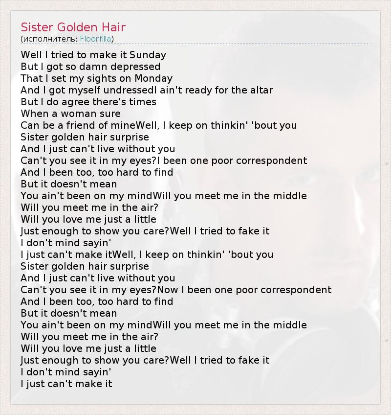 Well I tried to make it Sunday But I got so damn depressed That I set my sights on Monday And I got myself undressedI ain't ready for the altar But I do agree there's times When a woman sure Can be a friend of mineWell, I keep on thinkin' 'bout you Sister golden hair surprise And I just can't live without you Can't you see it in my eyes?I been one poor correspondent And I been too, too hard to find But it doesn't mean You ain't been on my mindWill you meet me in the middle Will you meet me in the air? Will you love me just a little Just enough to show you care?Well I tried to fake it I don't mind sayin' I just can't make itWell, I keep on thinkin' 'bout you Sister golden hair surprise And I just can't live without you Can't you see it in my eyes?Now I been one poor correspondent And I been too, too hard to find But it doesn't mean You ain't been on my mindWill you meet me in the middle Will you meet me in the air? Will you love me just a little Just enough to show you care?Well I tried to fake it I don't mind sayin' I just can't make it