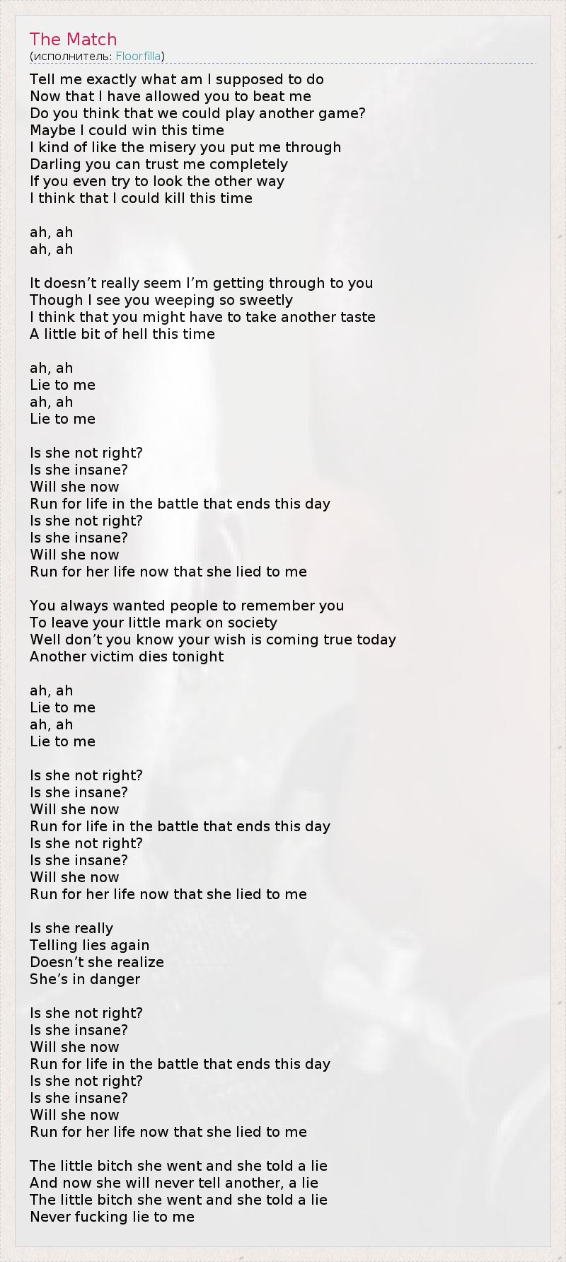 Скажи мне точно, чего ты хочешь от меня? Теперь, когда я позволил победить себя. Как думаешь, могли бы мы сыграть ещё раз? Возможно, в этот раз я выиграю. Мне почти нравится, как ты меня унижаешь, Дорогая, можешь полностью мне поверить, Если ты хоть попытаешься взглянуть по-другому, Думаю, в этот раз я могу и убить. А, а А, а На самом деле не похоже, что мои слова до тебя доходят, Хотя я вижу, как мило ты рыдаешь. Я думаю, что возможно, тебе придётся Отведать ещё небольшую порцию ада. А, а, Солги мне, А, а, Солги мне! Она не в порядке? Она сумасшедшая? Станет ли она Бороться за жизнь в битве, которая кончится сегодня? Она не в порядке? Она сумасшедшая? Станет ли она Бороться за жизнь после того, как обманула меня? Ты всегда хотела, чтобы тебя запомнили, Оставить о себе память в обществе, Ну и, ты не понимаешь, что твоя мечта сегодня воплотится в жизнь? Ещё одна жертва умрёт сегодня. А, а, Солги мне, А, а, Солги мне! Она не в порядке? Она сумасшедшая? Станет ли она Бороться за жизнь в битве, которая кончится сегодня? Она не в порядке? Она сумасшедшая? Станет ли она Бороться за жизнь после того, как обманула меня? Неужели она действительно Снова лжёт? Неужели она не понимает, Что её жизнь висит на волоске? Она не в порядке? Она сумасшедшая? Станет ли она Бороться за жизнь в битве, которая кончится сегодня? Она не в порядке? Она сумасшедшая? Станет ли она Бороться за жизнь после того, как обманула меня? Маленькая су*ка, она пришла и солгала мне, А теперь она никогда не солжёт больше, Маленькая су*а, она пришла и солгала мне, Никогда, бл***, не ври мне!