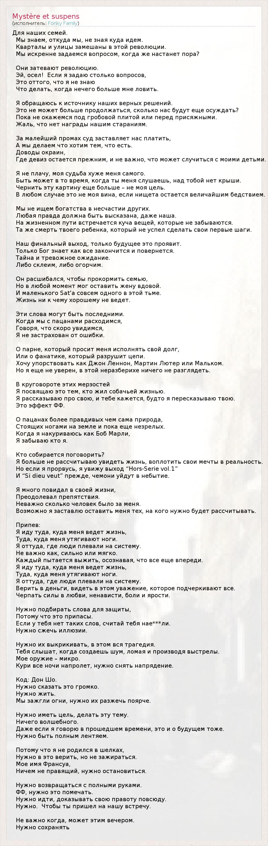Для наших семей. Мы знаем, откуда мы, не зная куда идем. Кварталы и улицы замешаны в этой революции. Мы искренне задаемся вопросом, когда же настанет пора? Они затевают революцию. Эй, осел! Если я задаю столько вопросов, Это оттого, что я не знаю Что делать, когда нечего больше мне ловить. Я обращаюсь к источнику наших верных решений. Это не может больше продолжаться, сколько нас будут еще осуждать? Пока не окажемся под гробовой плитой или перед присяжными. Жаль, что нет награды нашим стараниям. За малейший промах суд заставляет нас платить, А мы делаем что хотим тем, что есть. Доводы окраин, Где девиз остается прежним, и не важно, что может случиться с моими детьми. Я не плачу, моя судьба хуже меня самого. Быть может в то время, когда ты меня слушаешь, над тобой нет крыши. Чернить эту картину еще больше – не моя цель. В любом случае это не моя вина, если нищета остается величайшим бедствием. Мы не ищем богатства в несчастии других. Любая правда должна быть высказана, даже наша. На жизненном пути встречается куча вещей, которые не забываются. Та же смерть твоего ребенка, который не успел сделать свои первые шаги. Наш финальный выход, только будущее это проявит. Только Бог знает как все закончится и повернется. Тайна и тревожное ожидание. Либо склеим, либо огорчим. Он расшибался, чтобы прокормить семью, Но в любой момент мог оставить жену вдовой. И маленького Sat'а совсем одного в этой тьме. Жизнь ни к чему хорошему не ведет. Эти слова могут быть последними. Когда мы с пацанами расходимся, Говоря, что скоро увидимся, Я не застрахован от ошибки. О парне, который просит меня исполнять свой долг, Или о фанатике, который разрушит цепи. Хочу упорствовать как Джон Леннон, Мартин Лютер или Мальком. Но я еще не уверен, в этой неразберихе ничего не разглядеть. В круговороте этих мерзостей Я посвящаю это тем, кто жил собачьей жизнью. Я рассказываю про свою, и тебе кажется, будто я пересказываю твою. Это эффект ФФ. О пацанах более правдивых чем сама природа, Стоящих ногами на земле и пока еще незрелых. Когда я накуриваюсь как Боб Марли, Я забываю кто я. Кто собирается поговорить? Я больше не рассчитываю увидеть жизнь, воплотить свои мечты в реальность. Но если я прорвусь, я увижу выход “Hors-Serie vol.1” И “Si dieu veut” прежде, чемони уйдут в небытие. Я много повидал в своей жизни, Преодолевал препятствия. Неважно сколько человек было за меня. Возможно я заставлю оставить меня тех, на кого нужно будет рассчитывать. Припев: Я иду туда, куда меня ведет жизнь, Туда, куда меня утягивают ноги. Я оттуда, где люди плевали на систему. Не важно как, сильно или мягко. Каждый пытается выжить, осознавая, что все еще впереди. Я иду туда, куда меня ведет жизнь, Туда, куда меня утягивают ноги. Я оттуда, где люди плевали на систему. Верить в деньги, видеть в этом уважение, которое подчеркивают все. Черпать силы в любви, ненависти, боли и ярости. Нужно подбирать слова для защиты, Потому что это припасы. Если у тебя нет таких слов, считай тебя нае***ли. Нужно сжечь иллюзии. Нужно их выкрикивать, в этом вся трагедия. Тебя слышат, когда создаешь шум, ломая и производя выстрелы. Мое оружие – микро. Кури все ночи напролет, нужно снять напрядение. Код: Дон Шо. Нужно сказать это громко. Нужно жить. Мы зажгли огни, нужно их разжечь поярче. Нужно иметь цель, делать эту тему. Ничего волшебного. Даже если я говорю в прошедшем време