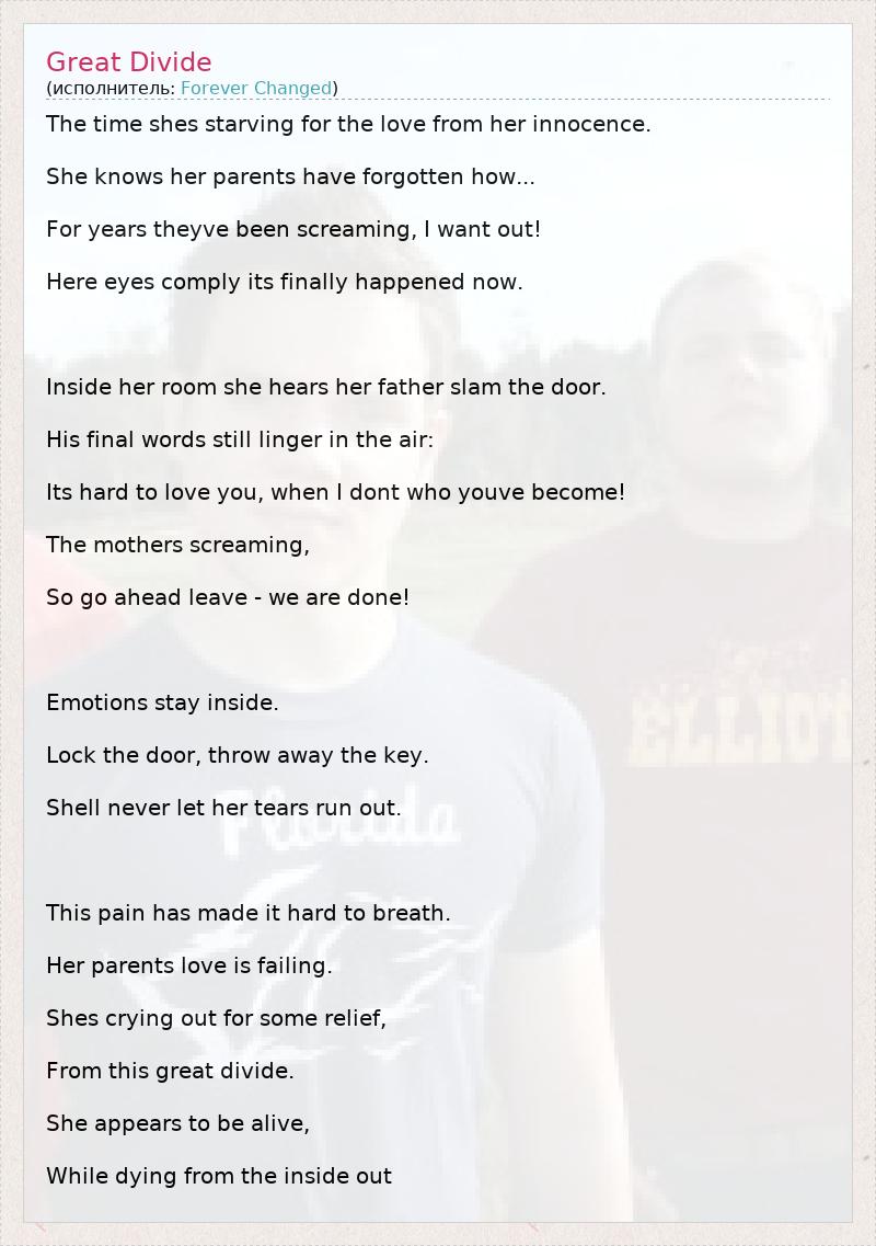 The time shes starving for the love from her innocence. She knows her parents have forgotten how... For years theyve been screaming, I want out! Here eyes comply its finally happened now. Inside her room she hears her father slam the door. His final words still linger in the air: Its hard to love you, when I dont who youve become! The mothers screaming, So go ahead leave - we are done! Emotions stay inside. Lock the door, throw away the key. Shell never let her tears run out. This pain has made it hard to breath. Her parents love is failing. Shes crying out for some relief, From this great divide. She appears to be alive, While dying from the inside out