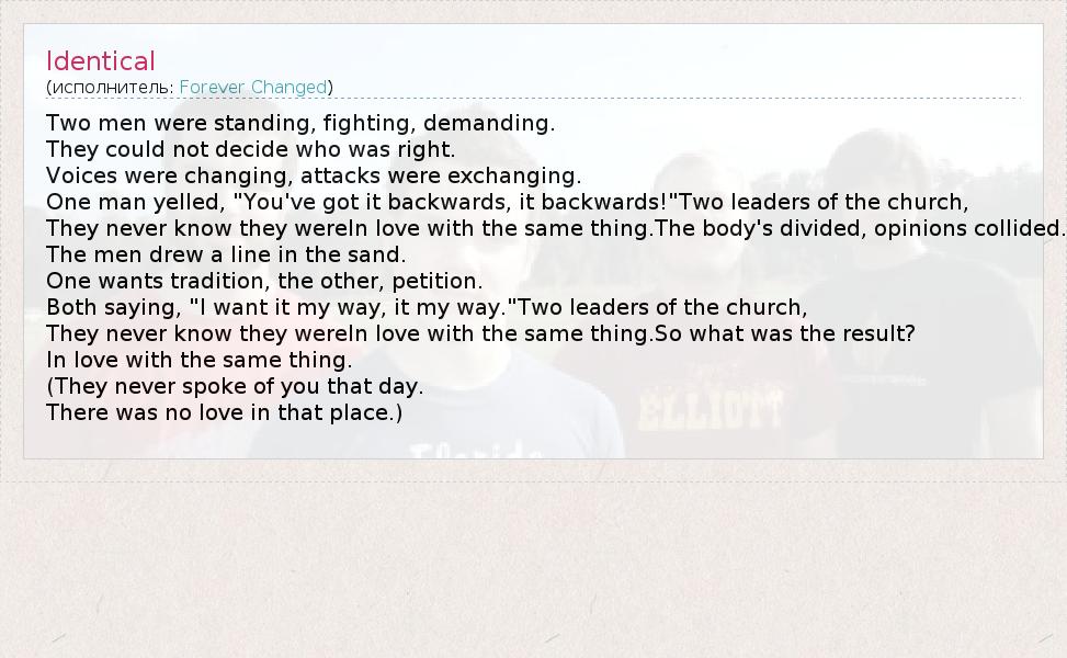 Two men were standing, fighting, demanding. They could not decide who was right. Voices were changing, attacks were exchanging. One man yelled, "You've got it backwards, it backwards!"Two leaders of the church, They never know they wereIn love with the same thing.The body's divided, opinions collided. The men drew a line in the sand. One wants tradition, the other, petition. Both saying, "I want it my way, it my way."Two leaders of the church, They never know they wereIn love with the same thing.So what was the result? In love with the same thing. (They never spoke of you that day. There was no love in that place.)