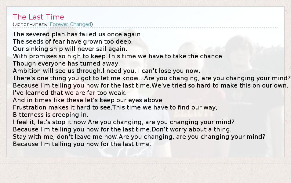The severed plan has failed us once again. The seeds of fear have grown too deep. Our sinking ship will never sail again. With promises so high to keep.This time we have to take the chance. Though everyone has turned away. Ambition will see us through.I need you, I can't lose you now. There's one thing you got to let me know...Are you changing, are you changing your mind? Because I'm telling you now for the last time.We've tried so hard to make this on our own. I've learned that we are far too weak. And in times like these let's keep our eyes above. Frustration makes it hard to see.This time we have to find our way, Bitterness is creeping in. I feel it, let's stop it now.Are you changing, are you changing your mind? Because I'm telling you now for the last time.Don't worry about a thing. Stay with me, don't leave me now.Are you changing, are you changing your mind? Because I'm telling you now for the last time.