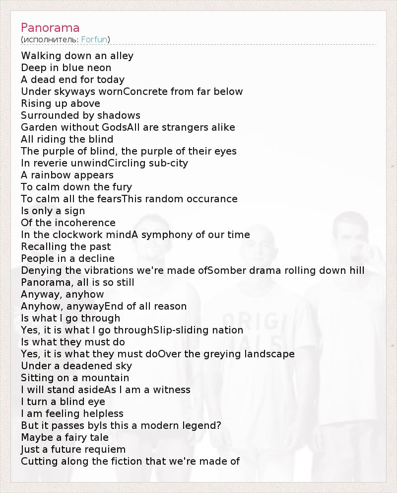 Walking down an alley Deep in blue neon A dead end for today Under skyways wornConcrete from far below Rising up above Surrounded by shadows Garden without GodsAll are strangers alike All riding the blind The purple of blind, the purple of their eyes In reverie unwindCircling sub-city A rainbow appears To calm down the fury To calm all the fearsThis random occurance Is only a sign Of the incoherence In the clockwork mindA symphony of our time Recalling the past People in a decline Denying the vibrations we're made ofSomber drama rolling down hill Panorama, all is so still Anyway, anyhow Anyhow, anywayEnd of all reason Is what I go through Yes, it is what I go throughSlip-sliding nation Is what they must do Yes, it is what they must doOver the greying landscape Under a deadened sky Sitting on a mountain I will stand asideAs I am a witness I turn a blind eye I am feeling helpless But it passes byIs this a modern legend? Maybe a fairy tale Just a future requiem Cutting along the fiction that we're made of