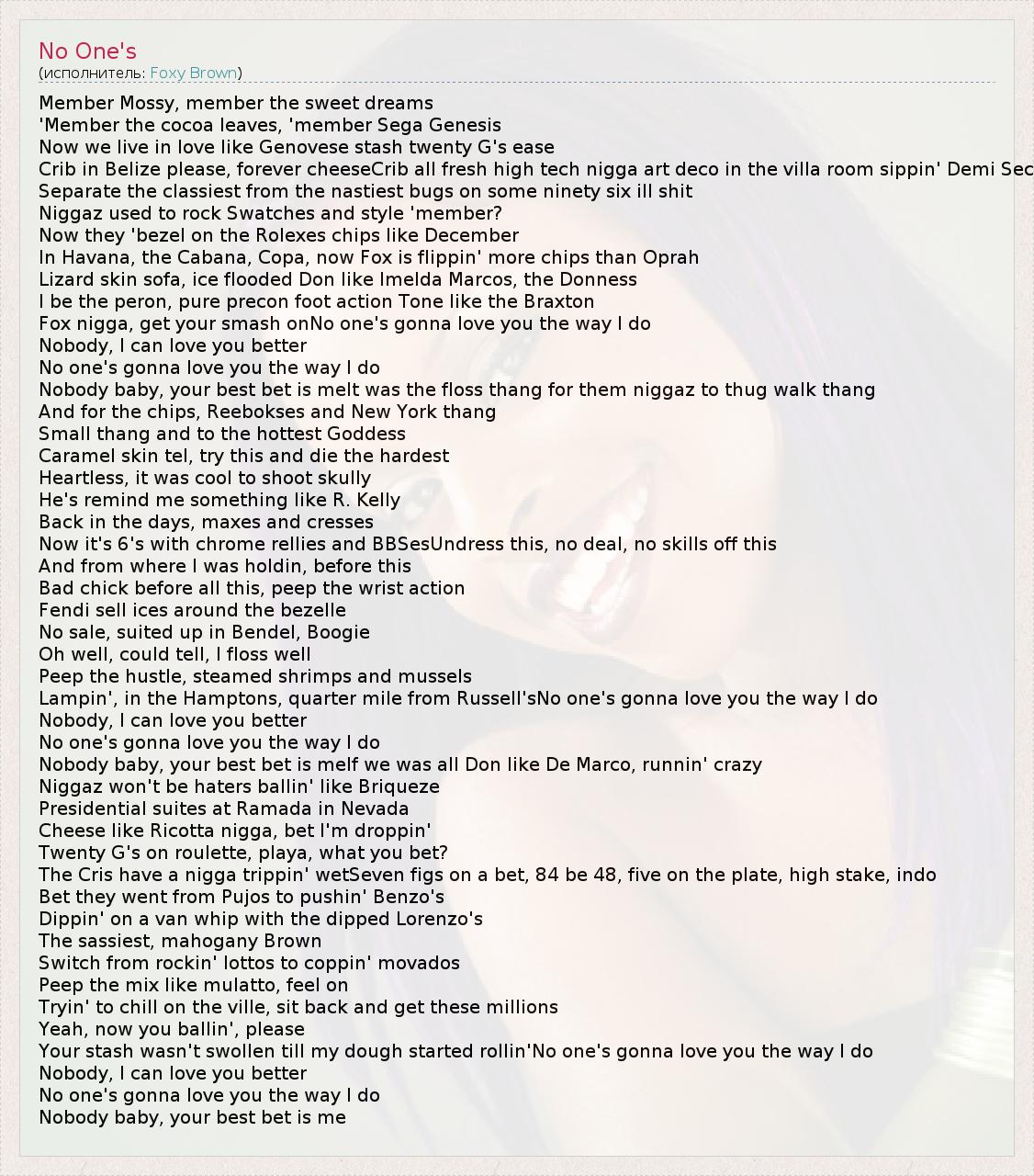 Member Mossy, member the sweet dreams 'Member the cocoa leaves, 'member Sega Genesis Now we live in love like Genovese stash twenty G's ease Crib in Belize please, forever cheeseCrib all fresh high tech nigga art deco in the villa room sippin' Demi Sec Separate the classiest from the nastiest bugs on some ninety six ill shit Niggaz used to rock Swatches and style 'member? Now they 'bezel on the Rolexes chips like December In Havana, the Cabana, Copa, now Fox is flippin' more chips than Oprah Lizard skin sofa, ice flooded Don like Imelda Marcos, the Donness I be the peron, pure precon foot action Tone like the Braxton Fox nigga, get your smash onNo one's gonna love you the way I do Nobody, I can love you better No one's gonna love you the way I do Nobody baby, your best bet is meIt was the floss thang for them niggaz to thug walk thang And for the chips, Reebokses and New York thang Small thang and to the hottest Goddess Caramel skin tel, try this and die the hardest Heartless, it was cool to shoot skully He's remind me something like R. Kelly Back in the days, maxes and cresses Now it's 6's with chrome rellies and BBSesUndress this, no deal, no skills off this And from where I was holdin, before this Bad chick before all this, peep the wrist action Fendi sell ices around the bezelle No sale, suited up in Bendel, Boogie Oh well, could tell, I floss well Peep the hustle, steamed shrimps and mussels Lampin', in the Hamptons, quarter mile from Russell'sNo one's gonna love you the way I do Nobody, I can love you better No one's gonna love you the way I do Nobody baby, your best bet is meIf we was all Don like De Marco, runnin' crazy Niggaz won't be haters ballin' like Briqueze Presidential suites at Ramada in Nevada Cheese like Ricotta nigga, bet I'm droppin' Twenty G's on roulette, playa, what you bet? The Cris have a nigga trippin' wetSeven figs on a bet, 84 be 48, five on the plate, high stake, indo Bet they went from Pujos to pushin' Benzo's Dippin' on a van whip with the dipped Lorenzo's The sassiest, mahogany Brown Switch from rockin' lottos to coppin' movados Peep the mix like mulatto, feel on Tryin' to chill on the ville, sit back and get these millions Yeah, now you ballin', please Your stash wasn't swollen till my dough started rollin'No one's gonna love you the way I do Nobody, I can love you better No one's gonna love you the way I do Nobody baby, your best bet is me