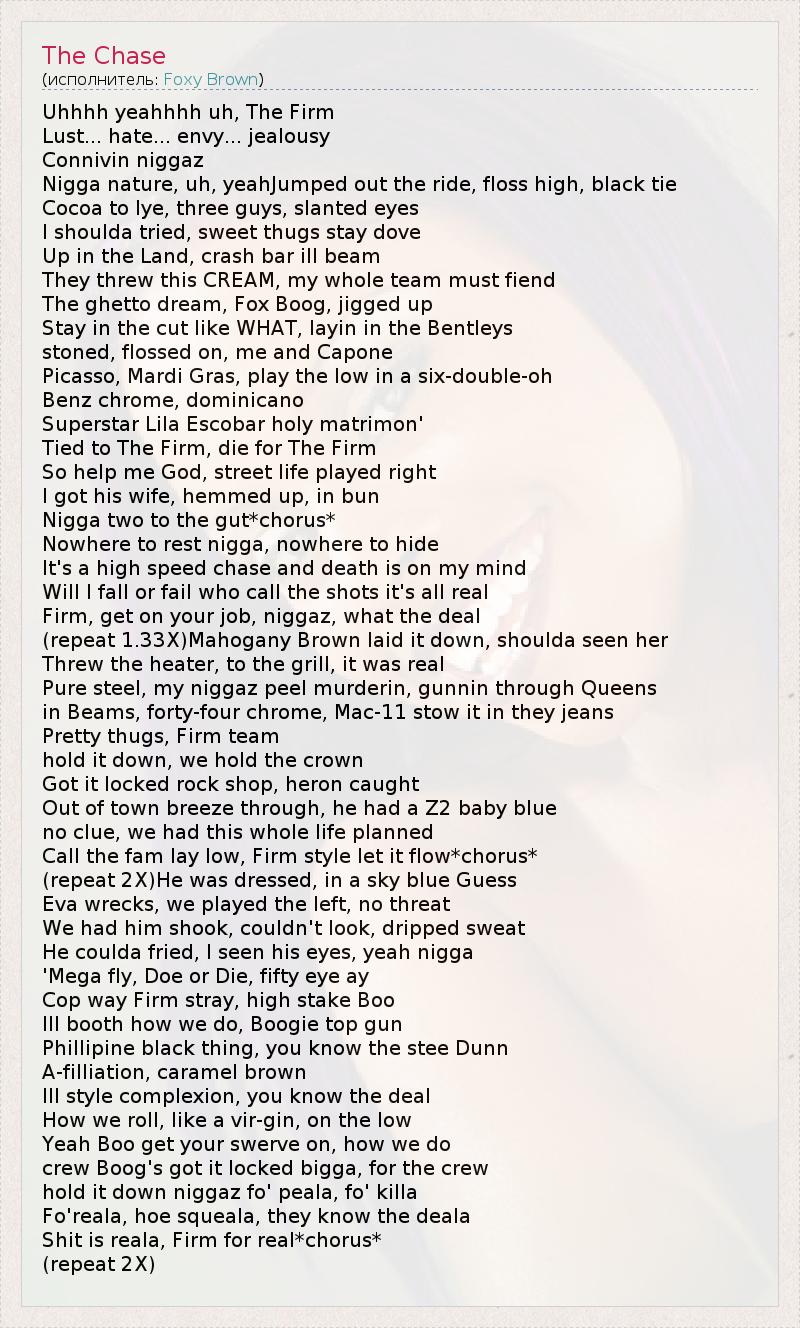 Это интересно:Foxy Brown — это не грациозная старушка Queen Latifah и даже не заводная тетка MC Lyte. Таким, как она, пронырливым особам палец в рот не суй. Новому поколению женского рэпа уже недостаточно, чтобы их уважали и считали реальными, несмотря на их пол; наоборот, они находят в женских слабостях свою выгоду и используют природную сексуальность в борьбе за слушателя, который, очевидно, скоро окончательно трансформируется... продолжение