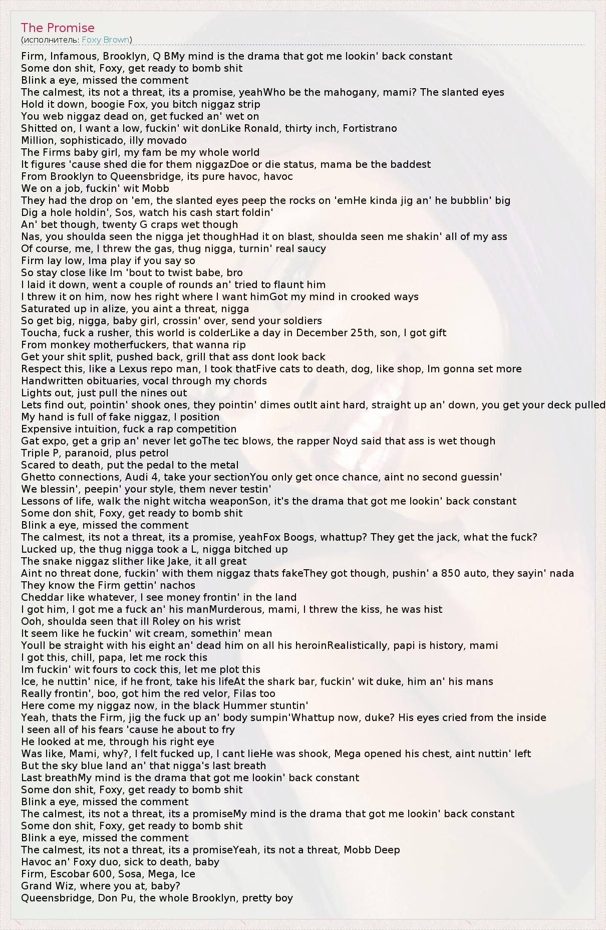 Firm, Infamous, Brooklyn, Q BMy mind is the drama that got me lookin' back constant Some don shit, Foxy, get ready to bomb shit Blink a eye, missed the comment The calmest, its not a threat, its a promise, yeahWho be the mahogany, mami? The slanted eyes Hold it down, boogie Fox, you bitch niggaz strip You web niggaz dead on, get fucked an' wet on Shitted on, I want a low, fuckin' wit donLike Ronald, thirty inch, Fortistrano Million, sophisticado, illy movado The Firms baby girl, my fam be my whole world It figures 'cause shed die for them niggazDoe or die status, mama be the baddest From Brooklyn to Queensbridge, its pure havoc, havoc We on a job, fuckin' wit Mobb They had the drop on 'em, the slanted eyes peep the rocks on 'emHe kinda jig an' he bubblin' big Dig a hole holdin', Sos, watch his cash start foldin' An' bet though, twenty G craps wet though Nas, you shoulda seen the nigga jet thoughHad it on blast, shoulda seen me shakin' all of my ass Of course, me, I threw the gas, thug nigga, turnin' real saucy Firm lay low, Ima play if you say so So stay close like Im 'bout to twist babe, bro I laid it down, went a couple of rounds an' tried to flaunt him I threw it on him, now hes right where I want himGot my mind in crooked ways Saturated up in alize, you aint a threat, nigga So get big, nigga, baby girl, crossin' over, send your soldiers Toucha, fuck a rusher, this world is colderLike a day in December 25th, son, I got gift From monkey motherfuckers, that wanna rip Get your shit split, pushed back, grill that ass dont look back Respect this, like a Lexus repo man, I took thatFive cats to death, dog, like shop, Im gonna set more Handwritten obituaries, vocal through my chords Lights out, just pull the nines out Lets find out, pointin' shook ones, they pointin' dimes outIt aint hard, straight up an' down, you get your deck pulled My hand is full of fake niggaz, I position Expensive intuition, fuck a rap competition Gat expo, get a grip an' never let goThe tec blows, the rapper Noyd said that ass is wet though Triple P, paranoid, plus petrol Scared to death, put the pedal to the metal Ghetto connections, Audi 4, take your sectionYou only get once chance, aint no second guessin' We blessin', peepin' your style, them never testin' Lessons of life, walk the night witcha weaponSon, it's the drama that got me lookin' back constant Some don shit, Foxy, get ready to bomb shit Blink a eye, missed the comment The calmest, its not a threat, its a promise, yeahFox Boogs, whattup? They get the jack, what the fuck? Lucked up, the thug nigga took a L, nigga bitched up The snake niggaz slither like Jake, it all great Aint no threat done, fuckin' with them niggaz thats fakeThey got though, pushin' a 850 auto, they sayin' nada They know the Firm gettin' nachos Cheddar like whatever, I see money frontin' in the land I got him, I got me a fuck an' his manMurderous, mami, I threw the kiss, he was hist Ooh, shoulda seen that ill Roley on his wrist It seem like he fuckin' wit cream, somethin' mean Youll be straight with his eight an' dead him on all his heroinRealistically, papi is history, mami I got this, chill, papa, let me rock this Im fuckin' wit fours to cock this, let me plot this Ice, he nuttin' nice, if he front, take his lifeAt the shark bar, fuckin' wit duke, him an' his mans Really frontin', boo, got him the red velor, Filas too Here come my niggaz now, in the black Hummer stuntin' Yeah, thats the Firm, jig the fuck up an' body sumpin'Whattup now, duke? His eyes cried from the inside I seen all of his fears 'cause he about to fry He looked at me, through his right eye Was like, Mami, why?, I felt fucked up, I cant lieHe was shook, Mega opened his chest, aint nuttin' left But the sky blue land an' that nigga's last breath Last breathMy mind is the drama that got me lookin' back constant Some don shit, Foxy, get ready to bomb shit Blink a eye, missed the comment The calmest, its not a threat, its a promiseMy mind is the drama that got me lookin' back constant Some don shit, Foxy, get ready to bomb shit Blink a eye, missed the comment The calmest, its not a threat, its a promiseYeah, its not a threat, Mobb Deep Havoc an' Foxy duo, sick to death, baby Firm, Escobar 600, Sosa, Mega, Ice Grand Wiz, where you at, baby? Queensbridge, Don Pu, the whole Brooklyn, pretty boy
