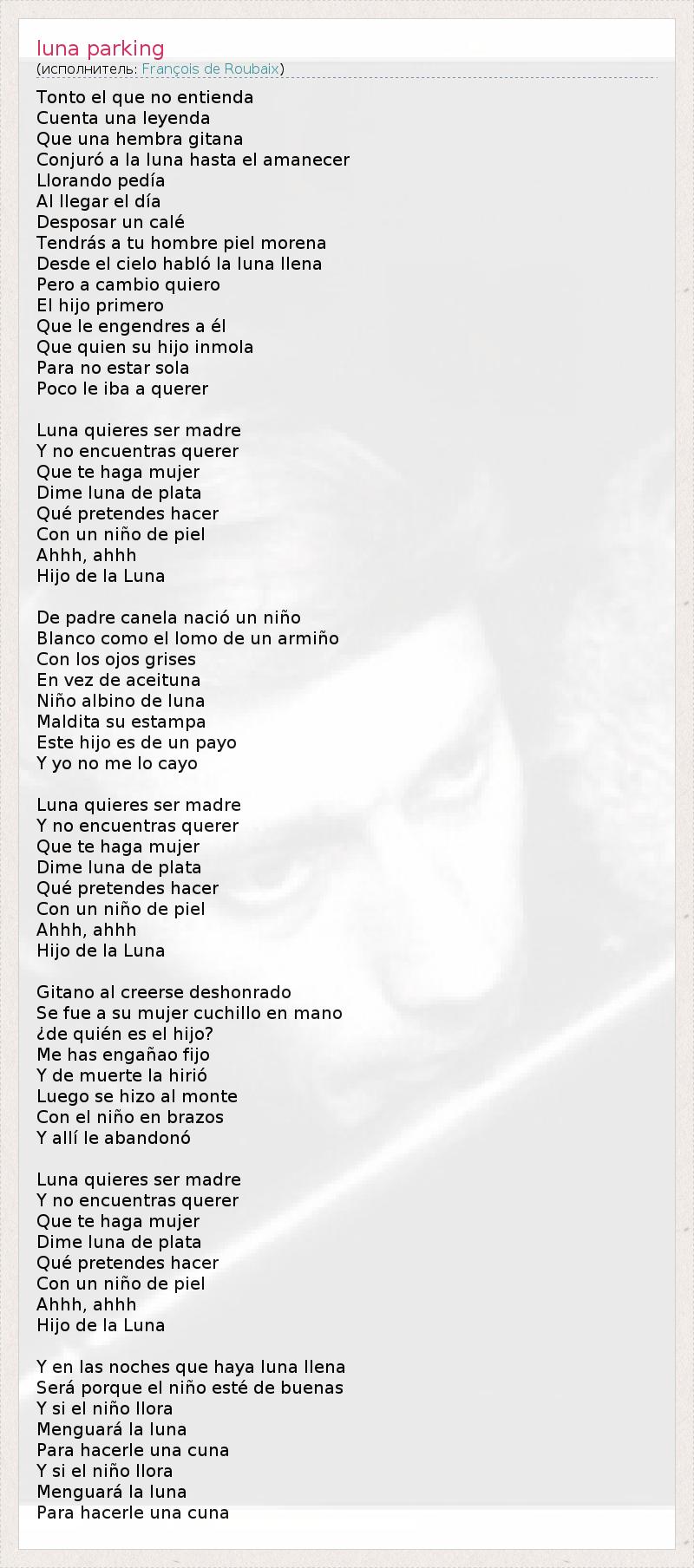 Дурак тот, кто не понимает. Одна легенда рассказывает, Как юная цыганка Умоляла луну. Плача, просила она до рассвета Выйти замуж за цыгана "Твой мужчина будет иметь смуглую кожу,- Говорила полная луна с неба, Но взамен я хочу Получить твоего первенца, Который будет у вас с ним," Тот, кто жертвует своим ребенком, Чтобы не быть одиноким, Не будет его Сильно любить Луна, ты хочешь быть матерью, Но не можешь найти свою любовь, Которая сможет сделать тебя женщиной. Скажи мне, серебряная луна, Что ты намерена делать С ребенком из плоти? Ах, Ах Сын Луны От отца со смуглой кожей родился ребенок Белый, словно брюхо горностая, С серыми глазами Вместо оливковых, Белый ребенок Луны "Будь он проклят! Это не сын цыгана, И ты не уйдешь безнаказанно" Луна, ты хочешь быть матерью, Но не можешь найти свою любовь, Которая сможет сделать тебя женщиной. Скажи мне, серебряная луна, Что ты намерена делать С ребенком из плоти? Ах, Ах Сын Луны Цыган, веря в то, что он опозорен, Шел на свою жену с ножом в руке: "Чей это ребенок? Я уверен, ты изменила мне!" И смертельно ранил ее. После поднялся он на гору С ребенком на руках И оставил его там Луна, ты хочешь быть матерью, Но не можешь найти свою любовь, Которая сможет сделать тебя женщиной. Скажи мне, серебряная луна, Что ты намерена делать С ребенком из плоти? Ах, Ах Сын Луны А ночами, если луна полная, Значит, ребенкок счастлив. А если ребенок плачет, Луна идёт на убыль, Чтобы сделать для него колыбель. А если ребенок плачет, Луна идёт на убыль, Чтобы сделать для него колыбель