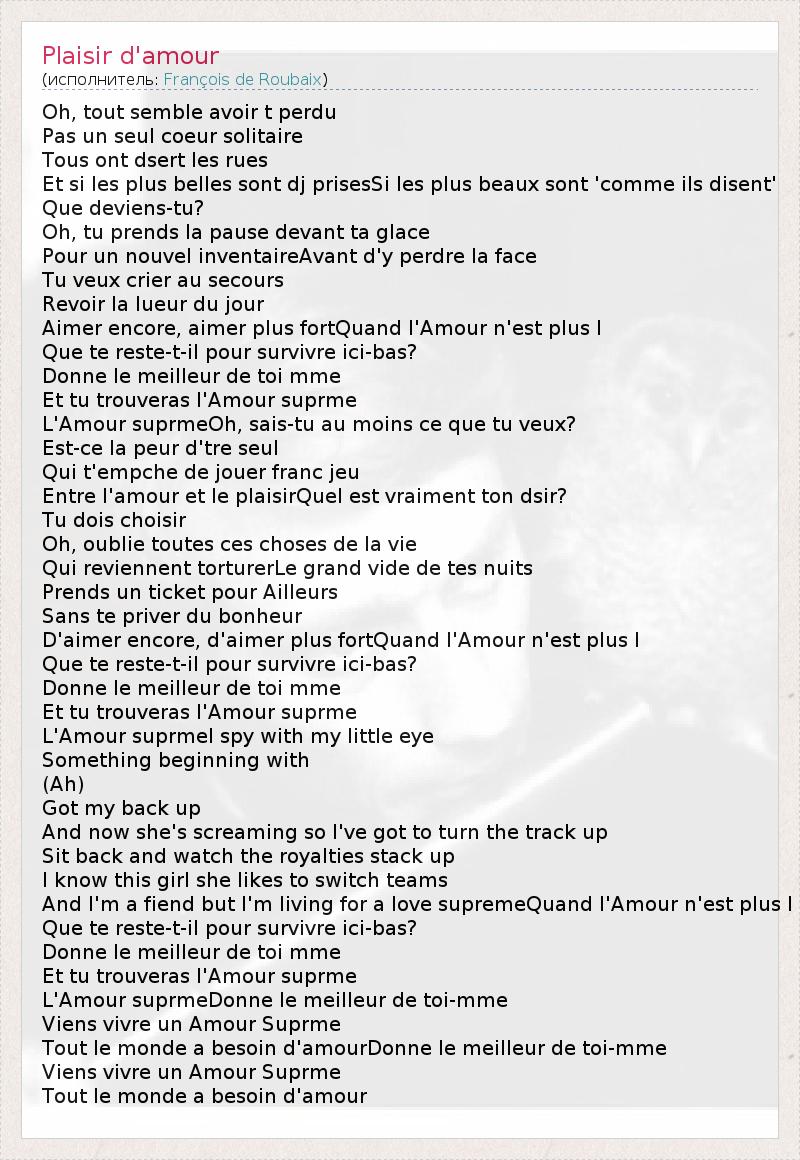 Oh, tout semble avoir t perdu Pas un seul coeur solitaire Tous ont dsert les rues Et si les plus belles sont dj prisesSi les plus beaux sont 'comme ils disent' Que deviens-tu? Oh, tu prends la pause devant ta glace Pour un nouvel inventaireAvant d'y perdre la face Tu veux crier au secours Revoir la lueur du jour Aimer encore, aimer plus fortQuand l'Amour n'est plus l Que te reste-t-il pour survivre ici-bas? Donne le meilleur de toi mme Et tu trouveras l'Amour suprme L'Amour suprmeOh, sais-tu au moins ce que tu veux? Est-ce la peur d'tre seul Qui t'empche de jouer franc jeu Entre l'amour et le plaisirQuel est vraiment ton dsir? Tu dois choisir Oh, oublie toutes ces choses de la vie Qui reviennent torturerLe grand vide de tes nuits Prends un ticket pour Ailleurs Sans te priver du bonheur D'aimer encore, d'aimer plus fortQuand l'Amour n'est plus l Que te reste-t-il pour survivre ici-bas? Donne le meilleur de toi mme Et tu trouveras l'Amour suprme L'Amour suprmeI spy with my little eye Something beginning with (Ah) Got my back up And now she's screaming so I've got to turn the track up Sit back and watch the royalties stack up I know this girl she likes to switch teams And I'm a fiend but I'm living for a love supremeQuand l'Amour n'est plus l Que te reste-t-il pour survivre ici-bas? Donne le meilleur de toi mme Et tu trouveras l'Amour suprme L'Amour suprmeDonne le meilleur de toi-mme Viens vivre un Amour Suprme Tout le monde a besoin d'amourDonne le meilleur de toi-mme Viens vivre un Amour Suprme Tout le monde a besoin d'amour