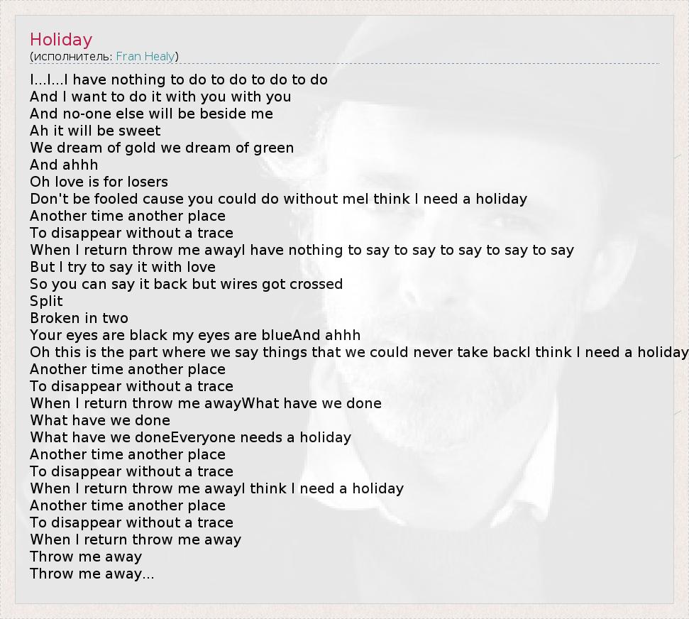 Это интересно:Fran Healy - британский рок-музыкант, солист группы Travis. Для их семи альбомов он написал почти все песни.4 октября 2010 Фрэнк выпустил сольник, “Wreckorder”, на своем лэйбле WreckordLabel. Альбом записывался в Берлине, где сейчас живет музыкант, и в Нью-Йорке, а в окончательное состояние приведен в Вермонте. В записи альбома участвовали Paul McCartney, Neko... продолжение