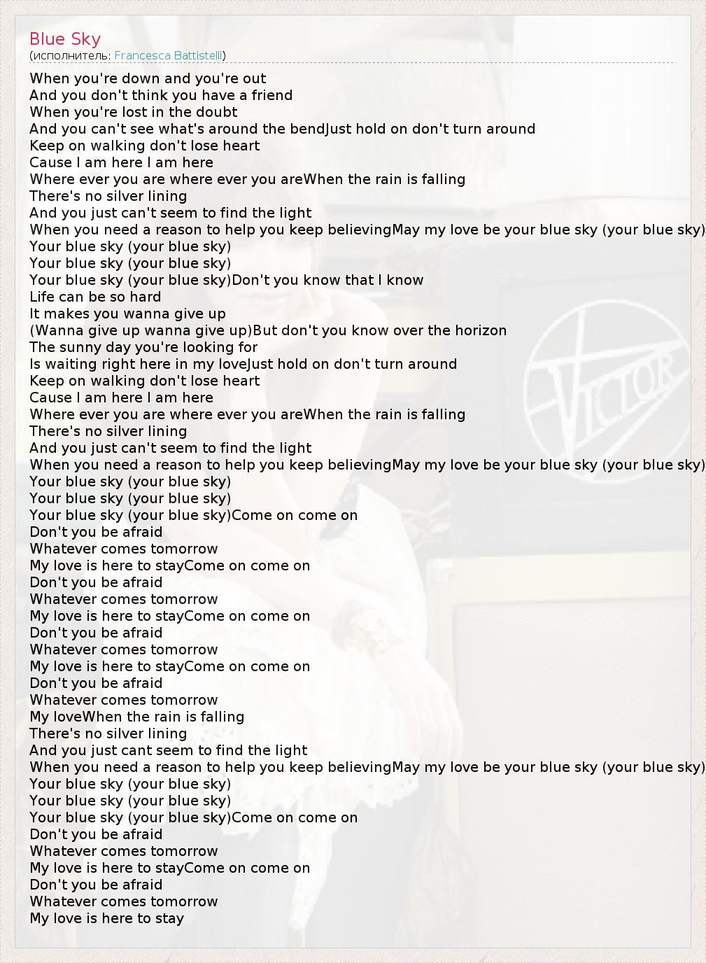 When you're down and you're out And you don't think you have a friend When you're lost in the doubt And you can't see what's around the bendJust hold on don't turn around Keep on walking don't lose heart Cause I am here I am here Where ever you are where ever you areWhen the rain is falling There's no silver lining And you just can't seem to find the light When you need a reason to help you keep believingMay my love be your blue sky (your blue sky) Your blue sky (your blue sky) Your blue sky (your blue sky) Your blue sky (your blue sky)Don't you know that I know Life can be so hard It makes you wanna give up (Wanna give up wanna give up)But don't you know over the horizon The sunny day you're looking for Is waiting right here in my loveJust hold on don't turn around Keep on walking don't lose heart Cause I am here I am here Where ever you are where ever you areWhen the rain is falling There's no silver lining And you just can't seem to find the light When you need a reason to help you keep believingMay my love be your blue sky (your blue sky) Your blue sky (your blue sky) Your blue sky (your blue sky) Your blue sky (your blue sky)Come on come on Don't you be afraid Whatever comes tomorrow My love is here to stayCome on come on Don't you be afraid Whatever comes tomorrow My love is here to stayCome on come on Don't you be afraid Whatever comes tomorrow My love is here to stayCome on come on Don't you be afraid Whatever comes tomorrow My loveWhen the rain is falling There's no silver lining And you just cant seem to find the light When you need a reason to help you keep believingMay my love be your blue sky (your blue sky) Your blue sky (your blue sky) Your blue sky (your blue sky) Your blue sky (your blue sky)Come on come on Don't you be afraid Whatever comes tomorrow My love is here to stayCome on come on Don't you be afraid Whatever comes tomorrow My love is here to stay