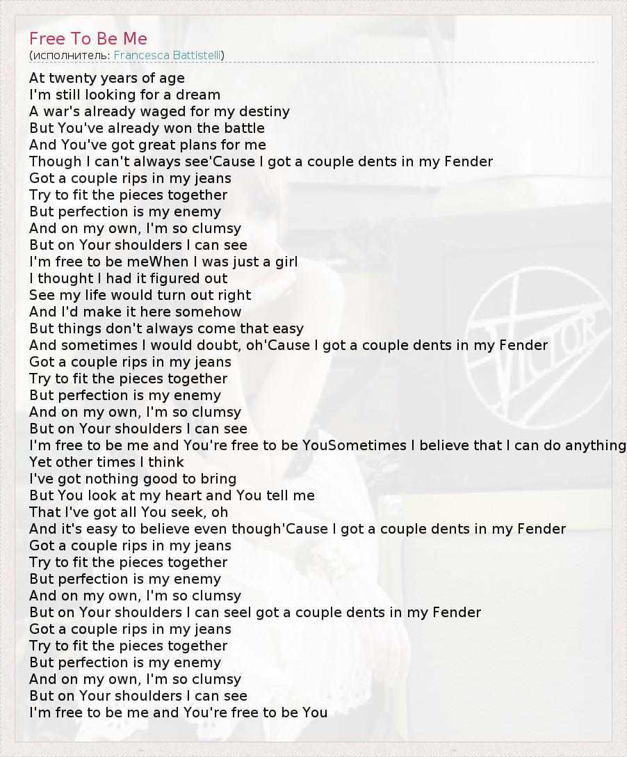 At twenty years of age I'm still looking for a dream A war's already waged for my destiny But You've already won the battle And You've got great plans for me Though I can't always see'Cause I got a couple dents in my Fender Got a couple rips in my jeans Try to fit the pieces together But perfection is my enemy And on my own, I'm so clumsy But on Your shoulders I can see I'm free to be meWhen I was just a girl I thought I had it figured out See my life would turn out right And I'd make it here somehow But things don't always come that easy And sometimes I would doubt, oh'Cause I got a couple dents in my Fender Got a couple rips in my jeans Try to fit the pieces together But perfection is my enemy And on my own, I'm so clumsy But on Your shoulders I can see I'm free to be me and You're free to be YouSometimes I believe that I can do anything Yet other times I think I've got nothing good to bring But You look at my heart and You tell me That I've got all You seek, oh And it's easy to believe even though'Cause I got a couple dents in my Fender Got a couple rips in my jeans Try to fit the pieces together But perfection is my enemy And on my own, I'm so clumsy But on Your shoulders I can seeI got a couple dents in my Fender Got a couple rips in my jeans Try to fit the pieces together But perfection is my enemy And on my own, I'm so clumsy But on Your shoulders I can see I'm free to be me and You're free to be You