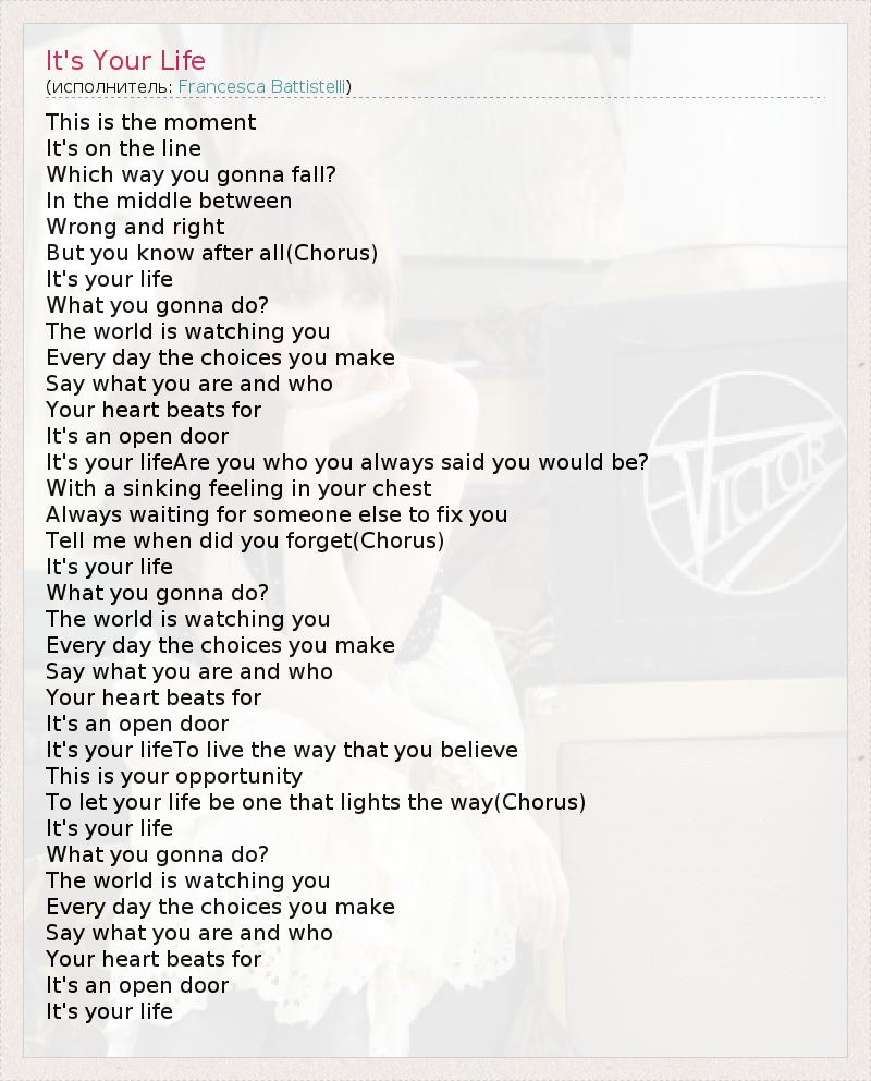 This is the moment It's on the line Which way you gonna fall? In the middle between Wrong and right But you know after all(Chorus) It's your life What you gonna do? The world is watching you Every day the choices you make Say what you are and who Your heart beats for It's an open door It's your lifeAre you who you always said you would be? With a sinking feeling in your chest Always waiting for someone else to fix you Tell me when did you forget(Chorus) It's your life What you gonna do? The world is watching you Every day the choices you make Say what you are and who Your heart beats for It's an open door It's your lifeTo live the way that you believe This is your opportunity To let your life be one that lights the way(Chorus) It's your life What you gonna do? The world is watching you Every day the choices you make Say what you are and who Your heart beats for It's an open door It's your life