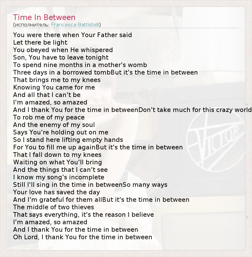 You were there when Your Father said Let there be light You obeyed when He whispered Son, You have to leave tonight To spend nine months in a mother's womb Three days in a borrowed tombBut it's the time in between That brings me to my knees Knowing You came for me And all that I can't be I'm amazed, so amazed And I thank You for the time in betweenDon't take much for this crazy world To rob me of my peace And the enemy of my soul Says You're holding out on me So I stand here lifting empty hands For You to fill me up againBut it's the time in between That I fall down to my knees Waiting on what You'll bring And the things that I can't see I know my song's incomplete Still I'll sing in the time in betweenSo many ways Your love has saved the day And I'm grateful for them allBut it's the time in between The middle of two thieves That says everything, it's the reason I believe I'm amazed, so amazed And I thank You for the time in between Oh Lord, I thank You for the time in between