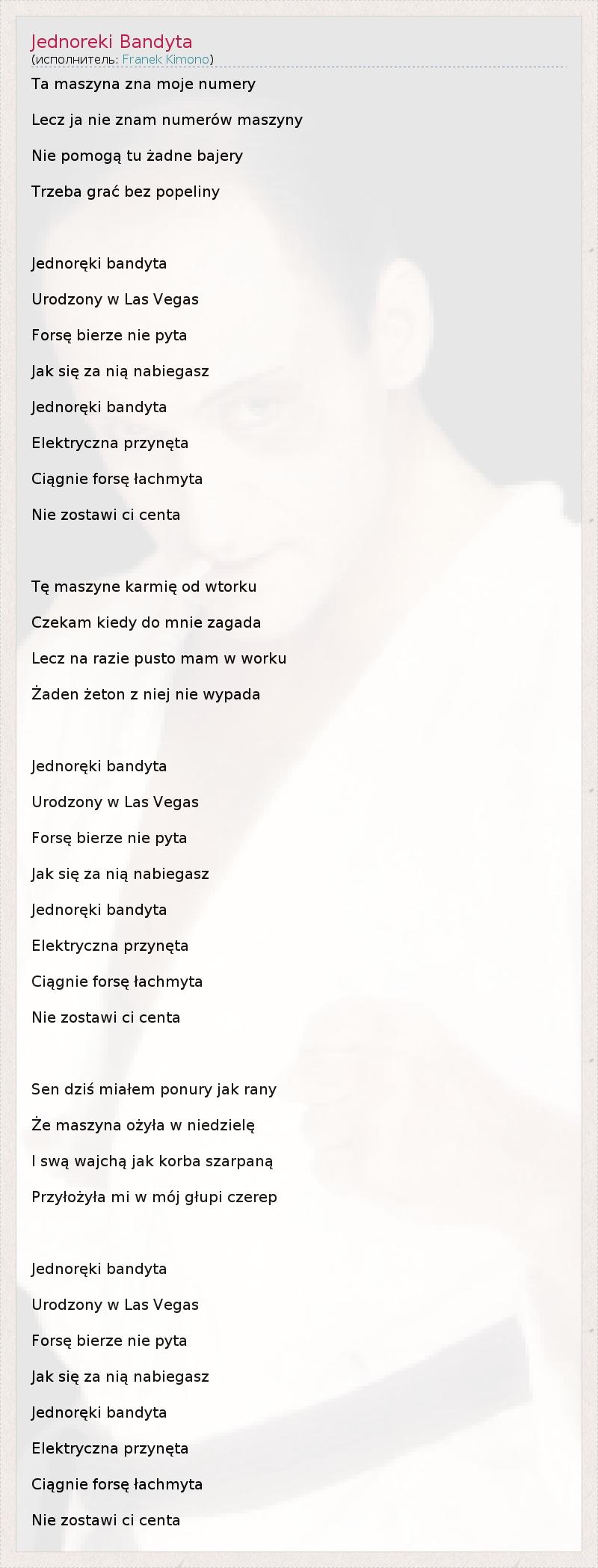 Ta maszyna zna moje numery Lecz ja nie znam numerów maszyny Nie pomogą tu żadne bajery Trzeba grać bez popeliny Jednoręki bandyta Urodzony w Las Vegas Forsę bierze nie pyta Jak się za nią nabiegasz Jednoręki bandyta Elektryczna przynęta Ciągnie forsę łachmyta Nie zostawi ci centa Tę maszyne karmię od wtorku Czekam kiedy do mnie zagada Lecz na razie pusto mam w worku Żaden żeton z niej nie wypada Jednoręki bandyta Urodzony w Las Vegas Forsę bierze nie pyta Jak się za nią nabiegasz Jednoręki bandyta Elektryczna przynęta Ciągnie forsę łachmyta Nie zostawi ci centa Sen dziś miałem ponury jak rany Że maszyna ożyła w niedzielę I swą wajchą jak korba szarpaną Przyłożyła mi w mój głupi czerep Jednoręki bandyta Urodzony w Las Vegas Forsę bierze nie pyta Jak się za nią nabiegasz Jednoręki bandyta Elektryczna przynęta Ciągnie forsę łachmyta Nie zostawi ci centa