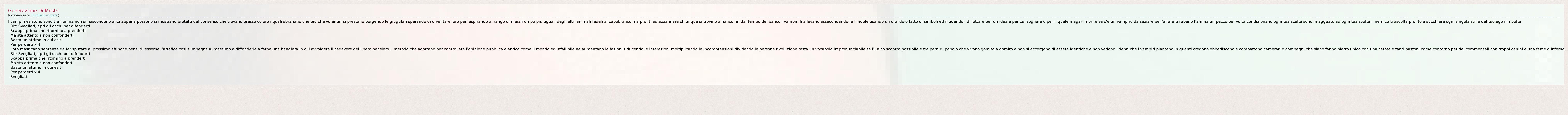 Loro masticano sentenze da far sputare al prossimo affinche pensi di esserne l'artefice cosi s'impegna al massimo a diffonderle a farne una bandiera in cui avvolgere il cadavere del libero pensiero Il metodo che adottano per controllare l'opinione pubblica e antico come il mondo ed infallibile ne aumentano le fazioni riducendo le interazioni moltiplicando le incomprensioni dividendo le persone rivoluzione resta un vocabolo impronunciabile se l'unico scontro possibile e tra parti di popolo che vivono gomito a gomito e non si accorgono di essere identiche e non vedono i denti che i vampiri piantano in quanti credono obbediscono e combattono camerati o compagni che siano fanno piatto unico con una carota e tanti bastoni come contorno per dei commensali con troppi canini e una fame d'inferno..