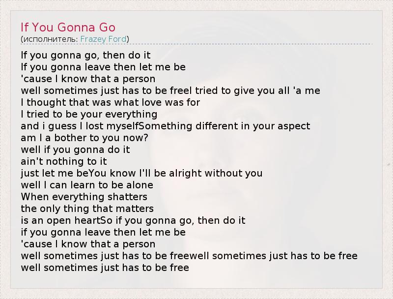 If you gonna go, then do it If you gonna leave then let me be 'cause I know that a person well sometimes just has to be freeI tried to give you all 'a me I thought that was what love was for I tried to be your everything and i guess I lost myselfSomething different in your aspect am I a bother to you now? well if you gonna do it ain't nothing to it just let me beYou know I'll be alright without you well I can learn to be alone When everything shatters the only thing that matters is an open heartSo if you gonna go, then do it if you gonna leave then let me be 'cause I know that a person well sometimes just has to be freewell sometimes just has to be free well sometimes just has to be free