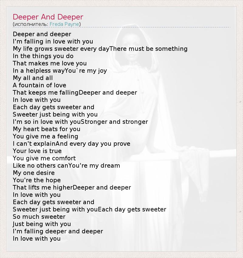 Deeper and deeper I'm falling in love with you My life grows sweeter every dayThere must be something In the things you do That makes me love you In a helpless wayYou`re my joy My all and all A fountain of love That keeps me fallingDeeper and deeper In love with you Each day gets sweeter and Sweeter just being with you I'm so in love with youStronger and stronger My heart beats for you You give me a feeling I can't explainAnd every day you prove Your love is true You give me comfort Like no others canYou're my dream My one desire You're the hope That lifts me higherDeeper and deeper In love with you Each day gets sweeter and Sweeter just being with youEach day gets sweeter So much sweeter Just being with you I'm falling deeper and deeper In love with you