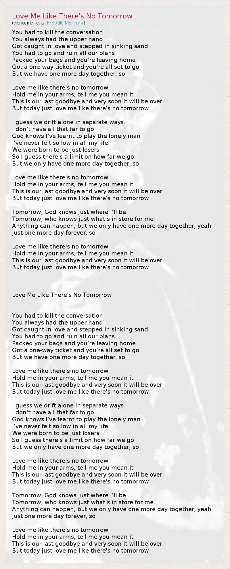 А как ты думаешь, о чем песня "Love Me Like There's No Tomorrow" ?