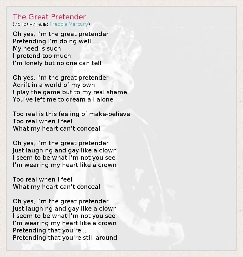 О, да, я - великий притворщик, Притворяюсь, что у меня все хорошо. Мой недостаток таков - Я слишком много притворяюсь. Я одинок, но никто не может этого сказать. О, да, я - великий притворщик, Плывущий по течению в своем собственном мире. Я играю в игру, но к моему искреннему стыду, Ты оставила меня мечтать в совершенном одиночестве. Это чувство притворства слишком настоящее, Слишком реально, когда я чувствую то, Что мое сердце не может утаить. О, да, я - великий притворщик, Просто смеющийся и веселый, как клоун. Понимаешь, я кажусь не тем, кем являюсь на самом деле. Я ношу свое сердце, словно корону. Слишком реально, когда я чувствую то, Что мое сердце не может утаить. О, да, я - великий притворщик, Просто смеющийся и веселый, как клоун. Понимаешь, я кажусь не тем, кем являюсь на самом деле. Я ношу свое сердце, словно корону. Притворяюсь, что ты... Притворяюсь, что ты все еще здесь.