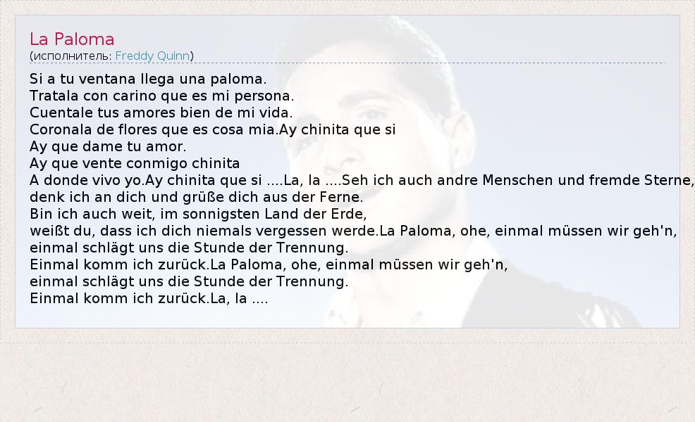 Si a tu ventana llega una paloma. Tratala con carino que es mi persona. Cuentale tus amores bien de mi vida. Coronala de flores que es cosa mia.Ay chinita que si Ay que dame tu amor. Ay que vente conmigo chinita A donde vivo yo.Ay chinita que si ....La, la ....Seh ich auch andre Menschen und fremde Sterne, denk ich an dich und grüße dich aus der Ferne. Bin ich auch weit, im sonnigsten Land der Erde, weißt du, dass ich dich niemals vergessen werde.La Paloma, ohe, einmal müssen wir geh'n, einmal schlägt uns die Stunde der Trennung. Einmal komm ich zurück.La Paloma, ohe, einmal müssen wir geh'n, einmal schlägt uns die Stunde der Trennung. Einmal komm ich zurück.La, la ....