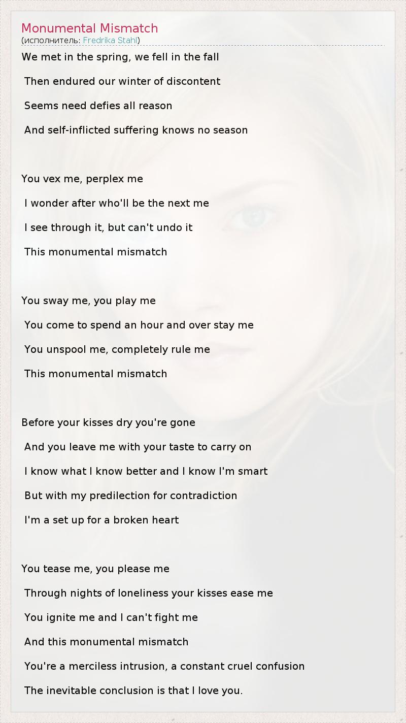 We met in the spring, we fell in the fall Then endured our winter of discontent Seems need defies all reason And self-inflicted suffering knows no season You vex me, perplex me I wonder after who'll be the next me I see through it, but can't undo it This monumental mismatch You sway me, you play me You come to spend an hour and over stay me You unspool me, completely rule me This monumental mismatch Before your kisses dry you're gone And you leave me with your taste to carry on I know what I know better and I know I'm smart But with my predilection for contradiction I'm a set up for a broken heart You tease me, you please me Through nights of loneliness your kisses ease me You ignite me and I can't fight me And this monumental mismatch You're a merciless intrusion, a constant cruel confusion The inevitable conclusion is that I love you.