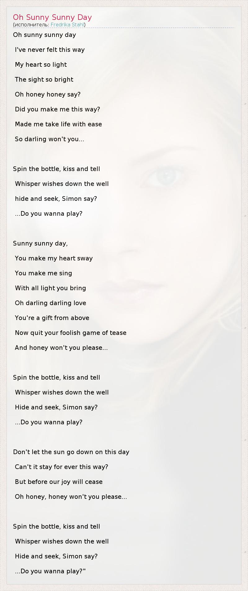 Oh sunny sunny day I've never felt this way My heart so light The sight so bright Oh honey honey say? Did you make me this way? Made me take life with ease So darling won't you... Spin the bottle, kiss and tell Whisper wishes down the well hide and seek, Simon say? ...Do you wanna play? Sunny sunny day, You make my heart sway You make me sing With all light you bring Oh darling darling love You're a gift from above Now quit your foolish game of tease And honey won't you please... Spin the bottle, kiss and tell Whisper wishes down the well Hide and seek, Simon say? ...Do you wanna play? Don't let the sun go down on this day Can't it stay for ever this way? But before our joy will cease Oh honey, honey won't you please... Spin the bottle, kiss and tell Whisper wishes down the well Hide and seek, Simon say? ...Do you wanna play?"