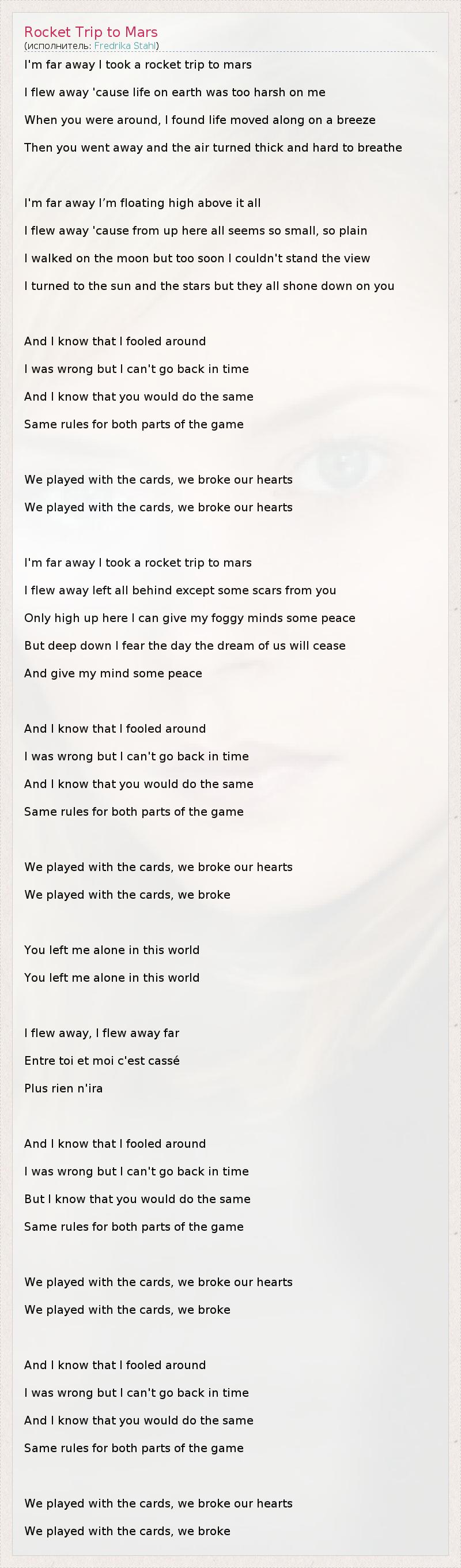 I'm far away I took a rocket trip to mars I flew away 'cause life on earth was too harsh on me When you were around, I found life moved along on a breeze Then you went away and the air turned thick and hard to breathe I'm far away I’m floating high above it all I flew away 'cause from up here all seems so small, so plain I walked on the moon but too soon I couldn't stand the view I turned to the sun and the stars but they all shone down on you And I know that I fooled around I was wrong but I can't go back in time And I know that you would do the same Same rules for both parts of the game We played with the cards, we broke our hearts We played with the cards, we broke our hearts I'm far away I took a rocket trip to mars I flew away left all behind except some scars from you Only high up here I can give my foggy minds some peace But deep down I fear the day the dream of us will cease And give my mind some peace And I know that I fooled around I was wrong but I can't go back in time And I know that you would do the same Same rules for both parts of the game We played with the cards, we broke our hearts We played with the cards, we broke You left me alone in this world You left me alone in this world I flew away, I flew away far Entre toi et moi c'est cassé Plus rien n'ira And I know that I fooled around I was wrong but I can't go back in time But I know that you would do the same Same rules for both parts of the game We played with the cards, we broke our hearts We played with the cards, we broke And I know that I fooled around I was wrong but I can't go back in time And I know that you would do the same Same rules for both parts of the game We played with the cards, we broke our hearts We played with the cards, we broke