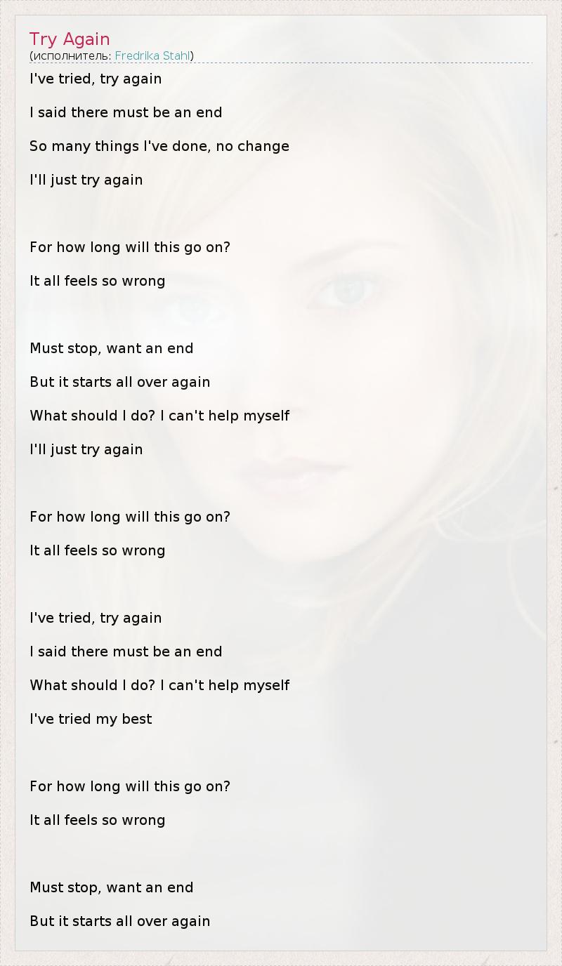I've tried, try again I said there must be an end So many things I've done, no change I'll just try again For how long will this go on? It all feels so wrong Must stop, want an end But it starts all over again What should I do? I can't help myself I'll just try again For how long will this go on? It all feels so wrong I've tried, try again I said there must be an end What should I do? I can't help myself I've tried my best For how long will this go on? It all feels so wrong Must stop, want an end But it starts all over again