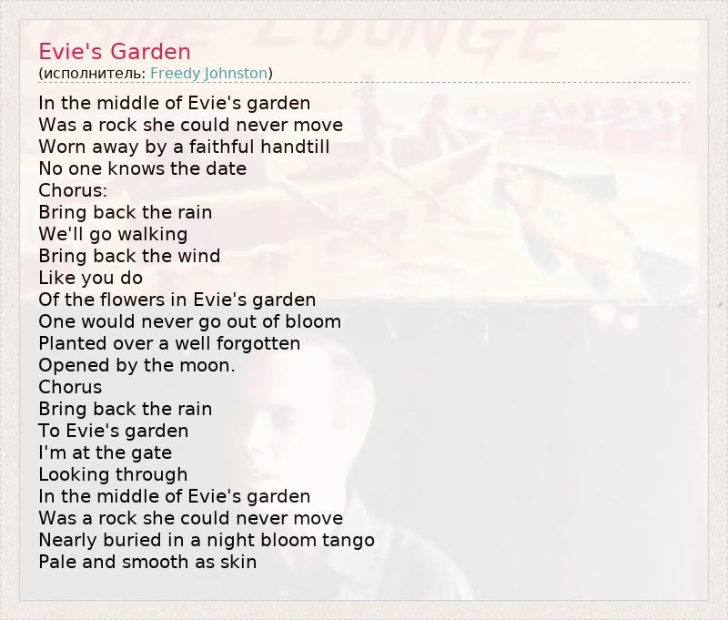 In the middle of Evie's garden Was a rock she could never move Worn away by a faithful handtill No one knows the date Chorus: Bring back the rain We'll go walking Bring back the wind Like you do Of the flowers in Evie's garden One would never go out of bloom Planted over a well forgotten Opened by the moon. Chorus Bring back the rain To Evie's garden I'm at the gate Looking through In the middle of Evie's garden Was a rock she could never move Nearly buried in a night bloom tango Pale and smooth as skin