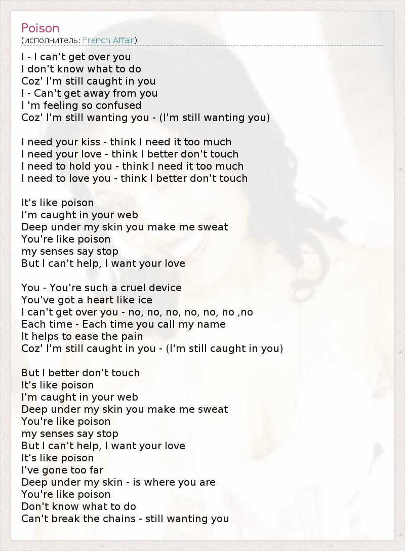 I - I can't get over you I don't know what to do Coz' I'm still caught in you I - Can't get away from you I 'm feeling so confused Coz' I'm still wanting you - (I'm still wanting you) I need your kiss - think I need it too much I need your love - think I better don't touch I need to hold you - think I need it too much I need to love you - think I better don't touch It's like poison I'm caught in your web Deep under my skin you make me sweat You're like poison my senses say stop But I can't help, I want your love You - You're such a cruel device You've got a heart like ice I can't get over you - no, no, no, no, no, no ,no Each time - Each time you call my name It helps to ease the pain Coz' I'm still caught in you - (I'm still caught in you) But I better don't touch It's like poison I'm caught in your web Deep under my skin you make me sweat You're like poison my senses say stop But I can't help, I want your love It's like poison I've gone too far Deep under my skin - is where you are You're like poison Don't know what to do Can't break the chains - still wanting you