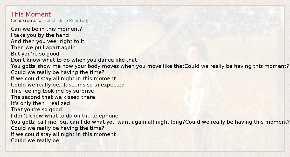 Can we be in this moment? I take you by the hand And then you veer right to it Then we pull apart again But you're so good Don't know what to do when you dance like that You gotta show me how your body moves when you move like thatCould we really be having this moment? Could we really be having the time? If we could stay all night in this moment Could we really be...It seems so unexpected This feeling took me by surprise The second that we kissed there It's only then I realized That you're so good I don't know what to do on the telephone You gotta call me, but can I do what you want again all night long?Could we really be having this moment? Could we really be having the time? If we could stay all night in this moment Could we really be...