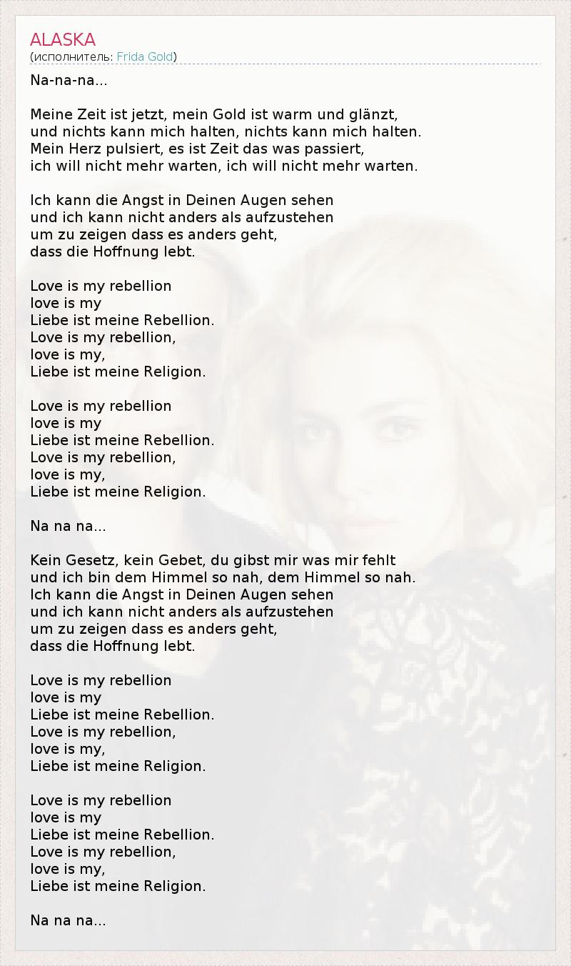 Na-na-na... Meine Zeit ist jetzt, mein Gold ist warm und glänzt, und nichts kann mich halten, nichts kann mich halten. Mein Herz pulsiert, es ist Zeit das was passiert, ich will nicht mehr warten, ich will nicht mehr warten. Ich kann die Angst in Deinen Augen sehen und ich kann nicht anders als aufzustehen um zu zeigen dass es anders geht, dass die Hoffnung lebt. Love is my rebellion love is my Liebe ist meine Rebellion. Love is my rebellion, love is my, Liebe ist meine Religion. Love is my rebellion love is my Liebe ist meine Rebellion. Love is my rebellion, love is my, Liebe ist meine Religion. Na na na... Kein Gesetz, kein Gebet, du gibst mir was mir fehlt und ich bin dem Himmel so nah, dem Himmel so nah. Ich kann die Angst in Deinen Augen sehen und ich kann nicht anders als aufzustehen um zu zeigen dass es anders geht, dass die Hoffnung lebt. Love is my rebellion love is my Liebe ist meine Rebellion. Love is my rebellion, love is my, Liebe ist meine Religion. Love is my rebellion love is my Liebe ist meine Rebellion. Love is my rebellion, love is my, Liebe ist meine Religion. Na na na...