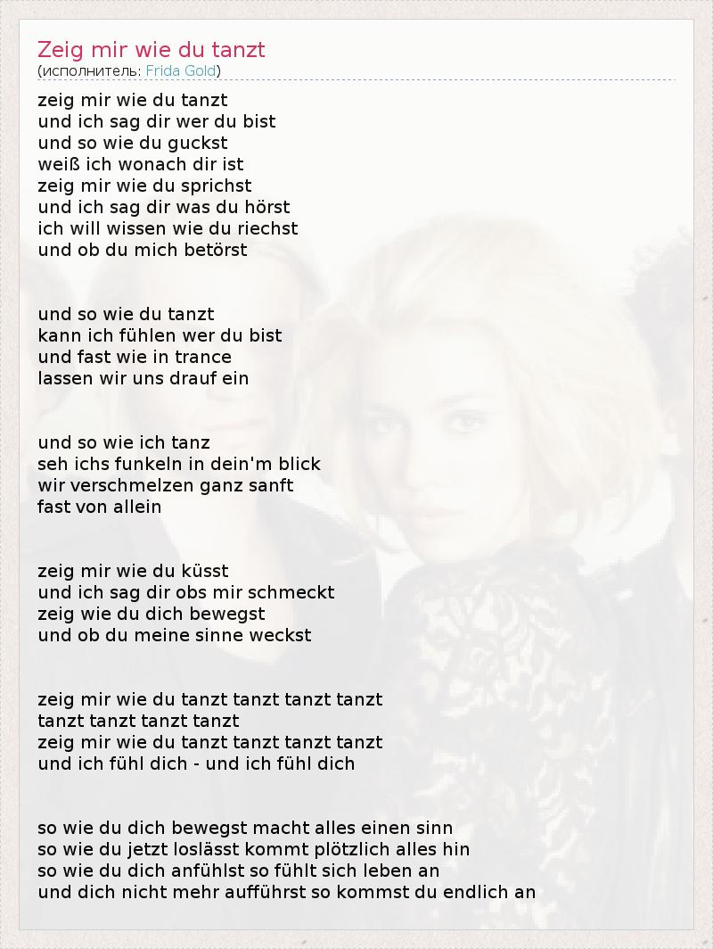 zeig mir wie du tanzt und ich sag dir wer du bist und so wie du guckst weiß ich wonach dir ist zeig mir wie du sprichst und ich sag dir was du hörst ich will wissen wie du riechst und ob du mich betörst und so wie du tanzt kann ich fühlen wer du bist und fast wie in trance lassen wir uns drauf ein und so wie ich tanz seh ichs funkeln in dein'm blick wir verschmelzen ganz sanft fast von allein zeig mir wie du küsst und ich sag dir obs mir schmeckt zeig wie du dich bewegst und ob du meine sinne weckst zeig mir wie du tanzt tanzt tanzt tanzt tanzt tanzt tanzt tanzt zeig mir wie du tanzt tanzt tanzt tanzt und ich fühl dich - und ich fühl dich so wie du dich bewegst macht alles einen sinn so wie du jetzt loslässt kommt plötzlich alles hin so wie du dich anfühlst so fühlt sich leben an und dich nicht mehr aufführst so kommst du endlich an