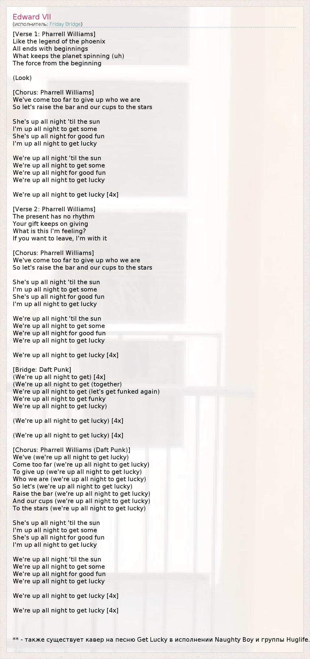 [Verse 1: Pharrell Williams] Like the legend of the phoenix All ends with beginnings What keeps the planet spinning (uh) The force from the beginning (Look) [Chorus: Pharrell Williams] We've come too far to give up who we are So let's raise the bar and our cups to the stars She's up all night 'til the sun I'm up all night to get some She's up all night for good fun I'm up all night to get lucky We're up all night 'til the sun We're up all night to get some We're up all night for good fun We're up all night to get lucky We're up all night to get lucky [4x] [Verse 2: Pharrell Williams] The present has no rhythm Your gift keeps on giving What is this I'm feeling? If you want to leave, I'm with it [Chorus: Pharrell Williams] We've come too far to give up who we are So let's raise the bar and our cups to the stars She's up all night 'til the sun I'm up all night to get some She's up all night for good fun I'm up all night to get lucky We're up all night 'til the sun We're up all night to get some We're up all night for good fun We're up all night to get lucky We're up all night to get lucky [4x] [Bridge: Daft Punk] (We're up all night to get) [4x] (We're up all night to get (together) We're up all night to get (let's get funked again) We're up all night to get funky We're up all night to get lucky) (We're up all night to get lucky) [4x] (We're up all night to get lucky) [4x] [Chorus: Pharrell Williams (Daft Punk)] We've (we're up all night to get lucky) Come too far (we're up all night to get lucky) To give up (we're up all night to get lucky) Who we are (we're up all night to get lucky) So let's (we're up all night to get lucky) Raise the bar (we're up all night to get lucky) And our cups (we're up all night to get lucky) To the stars (we're up all night to get lucky) She's up all night 'til the sun I'm up all night to get some She's up all night for good fun I'm up all night to get lucky We're up all night 'til the sun We're up all night to get some We're up all night for good fun We're up all night to get lucky We're up all night to get lucky [4x] We're up all night to get lucky [4x] ** - также существует кавер на песню Get Lucky в исполнении Naughty Boy и группы Huglife.
