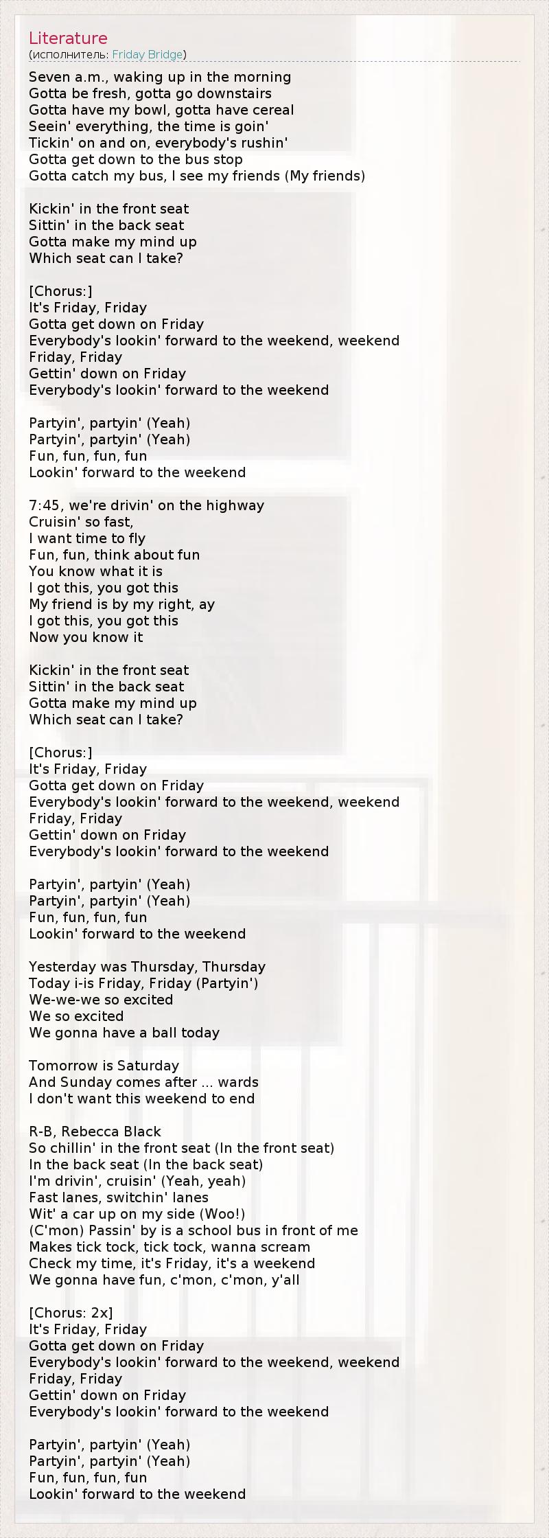 Seven a.m., waking up in the morning Gotta be fresh, gotta go downstairs Gotta have my bowl, gotta have cereal Seein' everything, the time is goin' Tickin' on and on, everybody's rushin' Gotta get down to the bus stop Gotta catch my bus, I see my friends (My friends) Kickin' in the front seat Sittin' in the back seat Gotta make my mind up Which seat can I take? [Chorus:] It's Friday, Friday Gotta get down on Friday Everybody's lookin' forward to the weekend, weekend Friday, Friday Gettin' down on Friday Everybody's lookin' forward to the weekend Partyin', partyin' (Yeah) Partyin', partyin' (Yeah) Fun, fun, fun, fun Lookin' forward to the weekend 7:45, we're drivin' on the highway Cruisin' so fast, I want time to fly Fun, fun, think about fun You know what it is I got this, you got this My friend is by my right, ay I got this, you got this Now you know it Kickin' in the front seat Sittin' in the back seat Gotta make my mind up Which seat can I take? [Chorus:] It's Friday, Friday Gotta get down on Friday Everybody's lookin' forward to the weekend, weekend Friday, Friday Gettin' down on Friday Everybody's lookin' forward to the weekend Partyin', partyin' (Yeah) Partyin', partyin' (Yeah) Fun, fun, fun, fun Lookin' forward to the weekend Yesterday was Thursday, Thursday Today i-is Friday, Friday (Partyin') We-we-we so excited We so excited We gonna have a ball today Tomorrow is Saturday And Sunday comes after ... wards I don't want this weekend to end R-B, Rebecca Black So chillin' in the front seat (In the front seat) In the back seat (In the back seat) I'm drivin', cruisin' (Yeah, yeah) Fast lanes, switchin' lanes Wit' a car up on my side (Woo!) (C'mon) Passin' by is a school bus in front of me Makes tick tock, tick tock, wanna scream Check my time, it's Friday, it's a weekend We gonna have fun, c'mon, c'mon, y'all [Chorus: 2x] It's Friday, Friday Gotta get down on Friday Everybody's lookin' forward to the weekend, weekend Friday, Friday Gettin' down on Friday Everybody's lookin' forward to the weekend Partyin', partyin' (Yeah) Partyin', partyin' (Yeah) Fun, fun, fun, fun Lookin' forward to the weekend