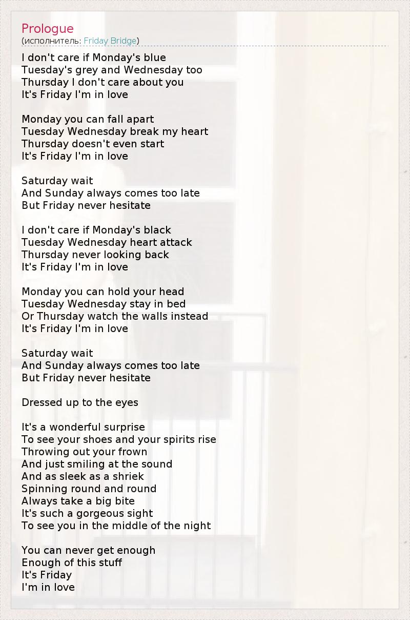 Мне всё равно, если понедельник уныл, Вторник сер и среда тоже, В четверг мне на тебя плевать, Вот пятница, я влюблён. В понедельник пропади ты пропадом, Вторник, среда - разбей моё сердце, Четверг даже не начинался, Но уже пятница, и я влюблён. Суббота подождёт, Воскресенье всегда настаёт слишком поздно, Но пятница никогда не колеблется. Мне всё равно, если понедельник мрачен, Во вторник и среду - сердечный приступ, В четверг не оглядывайся, А в пятницу я влюблён. В понедельник можно держаться за голову, Во вторник и среду оставаться в постели, В четверг - пялиться на стены, А в пятницу я влюблён. Суббота подождёт, Воскресенье всегда настаёт слишком поздно, Но пятница никогда не колеблется. Разодетая от и до! Какой сюрприз! Видеть тебя на шпильках и в приподнятом настроении, Не позволять тебе хмуриться, Улыбаться каждому звуку, И нам, гламурно одетым, Кружиться в танце любви... Всегда бери большой кусок, Это такое прекрасное зрелище: Видеть тебя среди ночи! Этим никогда Не насытишься. Настала пятница - Я влюблён!