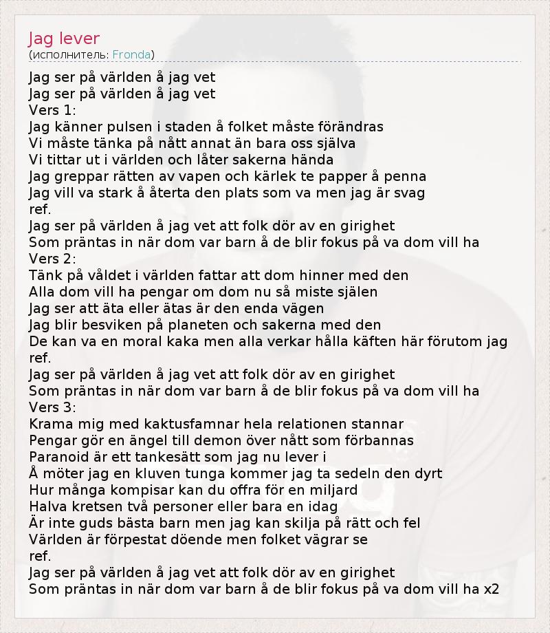 Jag ser på världen å jag vet Jag ser på världen å jag vet Vers 1: Jag känner pulsen i staden å folket måste förändras Vi måste tänka på nått annat än bara oss själva Vi tittar ut i världen och låter sakerna hända Jag greppar rätten av vapen och kärlek te papper å penna Jag vill va stark å återta den plats som va men jag är svag ref. Jag ser på världen å jag vet att folk dör av en girighet Som präntas in när dom var barn å de blir fokus på va dom vill ha Vers 2: Tänk på våldet i världen fattar att dom hinner med den Alla dom vill ha pengar om dom nu så miste själen Jag ser att äta eller ätas är den enda vägen Jag blir besviken på planeten och sakerna med den De kan va en moral kaka men alla verkar hålla käften här förutom jag ref. Jag ser på världen å jag vet att folk dör av en girighet Som präntas in när dom var barn å de blir fokus på va dom vill ha Vers 3: Krama mig med kaktusfamnar hela relationen stannar Pengar gör en ängel till demon över nått som förbannas Paranoid är ett tankesätt som jag nu lever i Å möter jag en kluven tunga kommer jag ta sedeln den dyrt Hur många kompisar kan du offra för en miljard Halva kretsen två personer eller bara en idag Är inte guds bästa barn men jag kan skilja på rätt och fel Världen är förpestat döende men folket vägrar se ref. Jag ser på världen å jag vet att folk dör av en girighet Som präntas in när dom var barn å de blir fokus på va dom vill ha x2