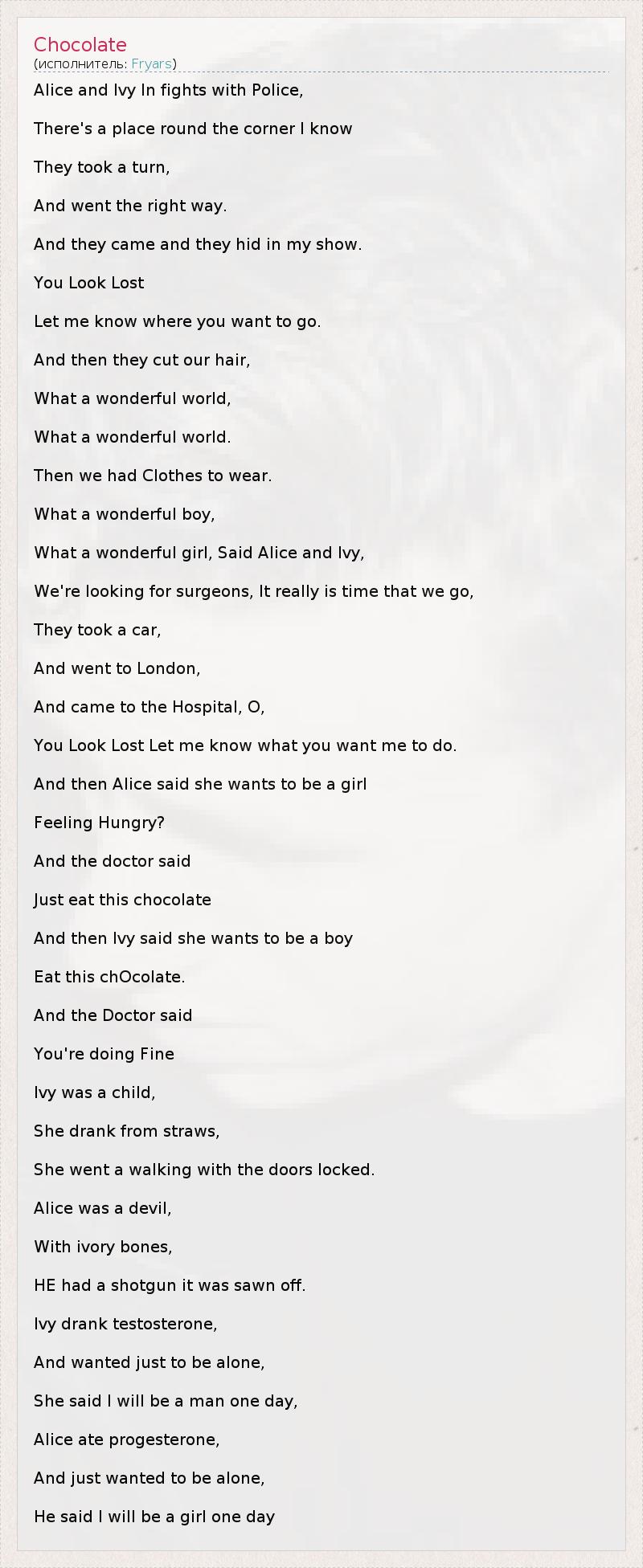Alice and Ivy In fights with Police, There's a place round the corner I know They took a turn, And went the right way. And they came and they hid in my show. You Look Lost Let me know where you want to go. And then they cut our hair, What a wonderful world, What a wonderful world. Then we had Clothes to wear. What a wonderful boy, What a wonderful girl, Said Alice and Ivy, We're looking for surgeons, It really is time that we go, They took a car, And went to London, And came to the Hospital, O, You Look Lost Let me know what you want me to do. And then Alice said she wants to be a girl Feeling Hungry? And the doctor said Just eat this chocolate And then Ivy said she wants to be a boy Eat this chOcolate. And the Doctor said You're doing Fine Ivy was a child, She drank from straws, She went a walking with the doors locked. Alice was a devil, With ivory bones, HE had a shotgun it was sawn off. Ivy drank testosterone, And wanted just to be alone, She said I will be a man one day, Alice ate progesterone, And just wanted to be alone, He said I will be a girl one day
