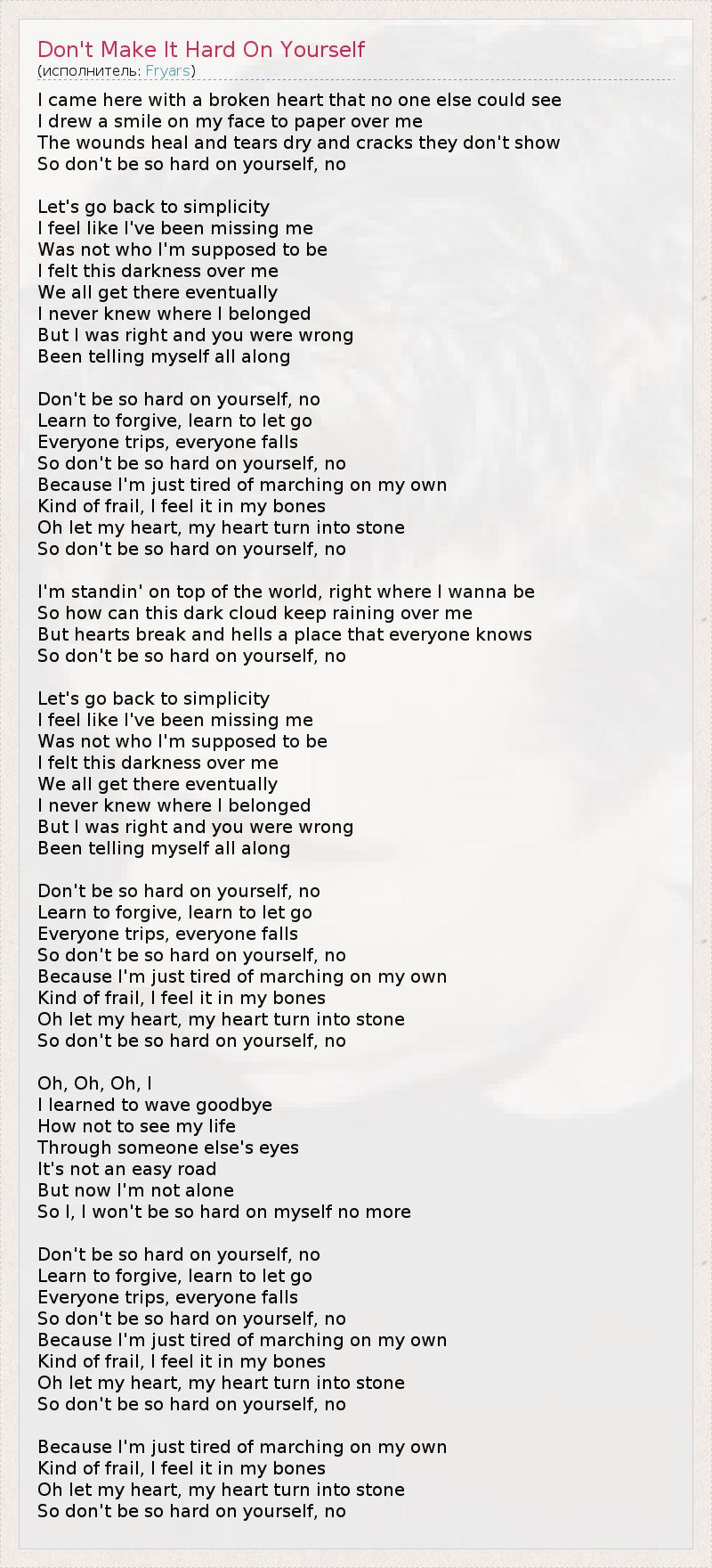 I came here with a broken heart that no one else could see I drew a smile on my face to paper over me The wounds heal and tears dry and cracks they don't show So don't be so hard on yourself, no Let's go back to simplicity I feel like I've been missing me Was not who I'm supposed to be I felt this darkness over me We all get there eventually I never knew where I belonged But I was right and you were wrong Been telling myself all along Don't be so hard on yourself, no Learn to forgive, learn to let go Everyone trips, everyone falls So don't be so hard on yourself, no Because I'm just tired of marching on my own Kind of frail, I feel it in my bones Oh let my heart, my heart turn into stone So don't be so hard on yourself, no I'm standin' on top of the world, right where I wanna be So how can this dark cloud keep raining over me But hearts break and hells a place that everyone knows So don't be so hard on yourself, no Let's go back to simplicity I feel like I've been missing me Was not who I'm supposed to be I felt this darkness over me We all get there eventually I never knew where I belonged But I was right and you were wrong Been telling myself all along Don't be so hard on yourself, no Learn to forgive, learn to let go Everyone trips, everyone falls So don't be so hard on yourself, no Because I'm just tired of marching on my own Kind of frail, I feel it in my bones Oh let my heart, my heart turn into stone So don't be so hard on yourself, no Oh, Oh, Oh, I I learned to wave goodbye How not to see my life Through someone else's eyes It's not an easy road But now I'm not alone So I, I won't be so hard on myself no more Don't be so hard on yourself, no Learn to forgive, learn to let go Everyone trips, everyone falls So don't be so hard on yourself, no Because I'm just tired of marching on my own Kind of frail, I feel it in my bones Oh let my heart, my heart turn into stone So don't be so hard on yourself, no Because I'm just tired of marching on my own Kind of frail, I feel it in my bones Oh let my heart, my heart turn into stone So don't be so hard on yourself, no